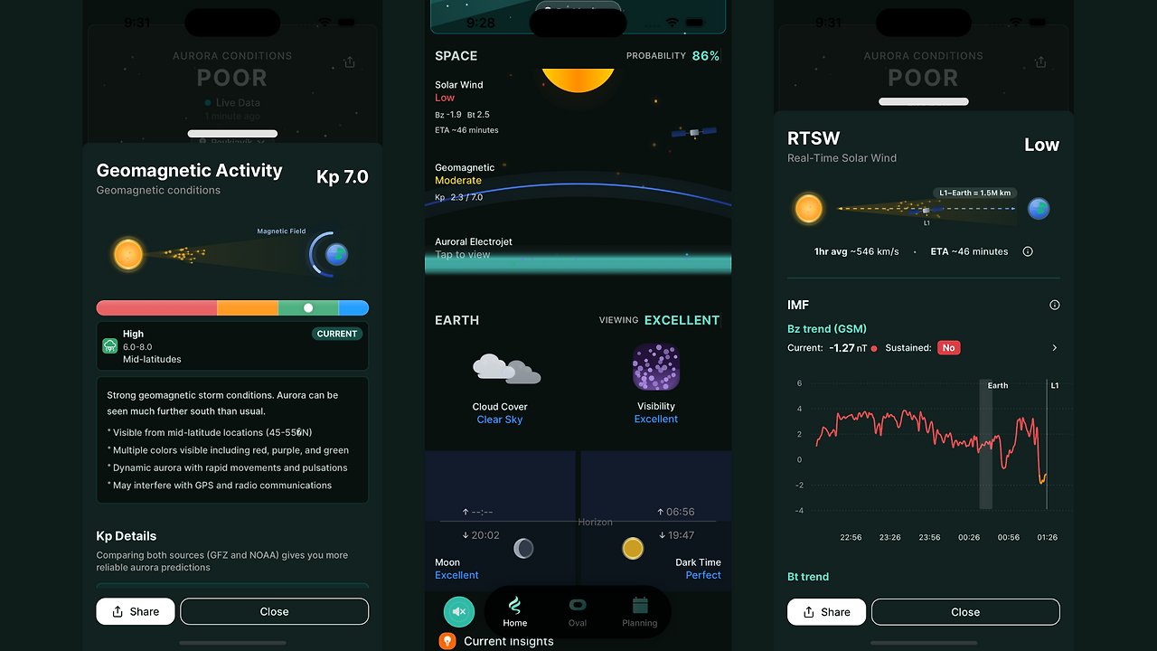 2주 만에 필수 기능만으로 빠르게 구현된 프로토타입으로 실제 오로라 헌팅을 해보았지만, "Kp 지수"만으로는 국지적으로 발생하는 태양 활동인 '서브스톰'을 예측하기 어렵다는 것을 알게 되었다. 단순히 정보량을 줄이고 쉽게 만드는 것은 사용자가 이해하기는 쉽지만 예보의 정확성이 떨어지게 되는 것이었다. 다시 처음 정의했던 문제로 돌아가서 원인을 근본적으로 파악하기 위해 전문가들의 글과 논문을 찾아보며 오로라의 발생 원인을 공부하기 시작했다.