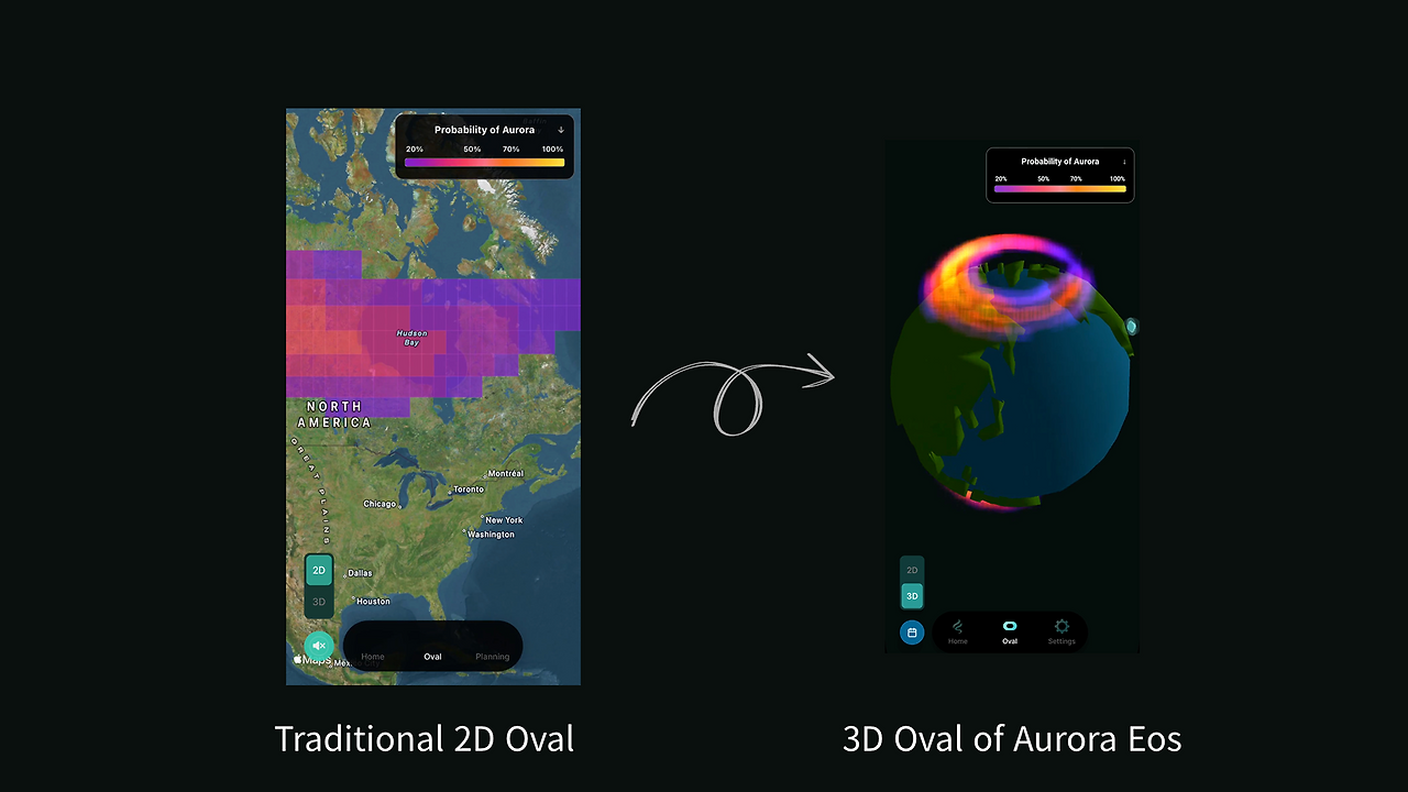 첫 프로토타입에서 제일 공들인 것은 3D 오로라 오발(Aurora Oval)이었다. 기존 2D 지도에서 벗어나 지구 자기장 활동이 얼마나 활발한지 더 직관적으로 아름답게 확인할 수 있다는 이유였다.