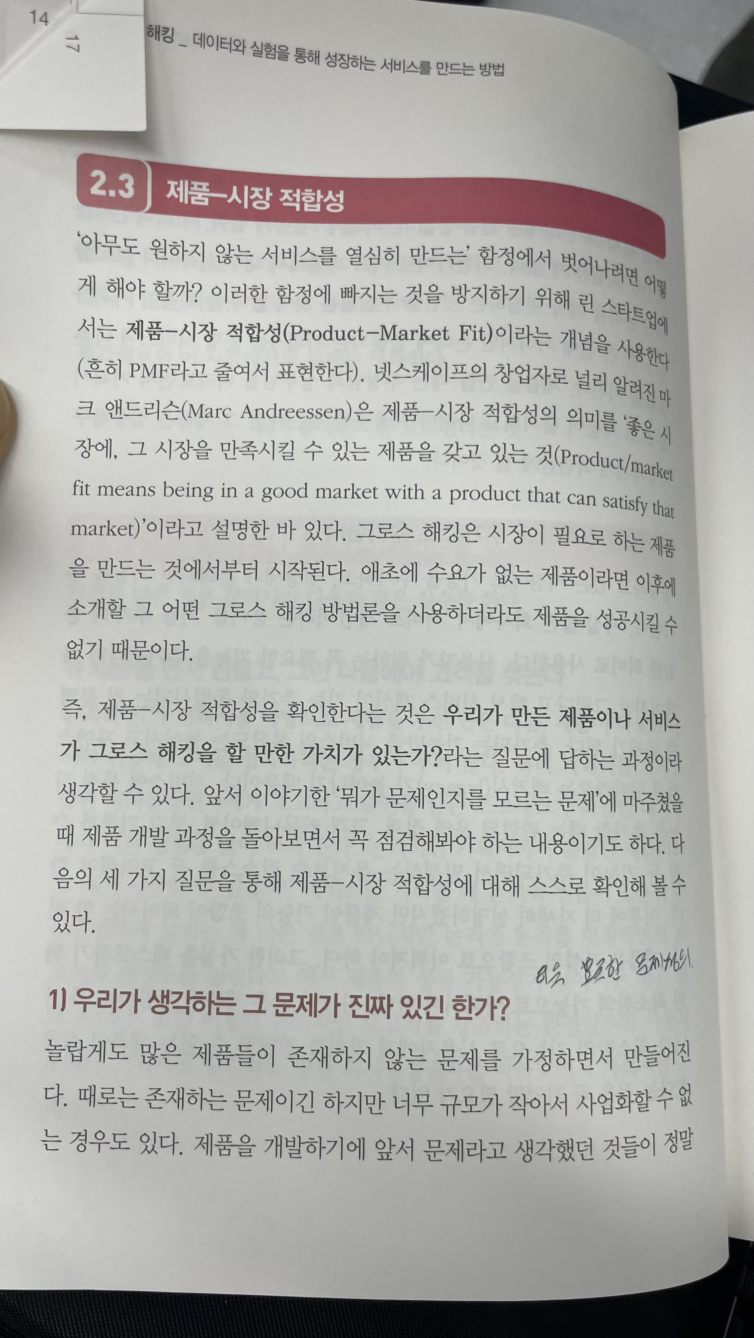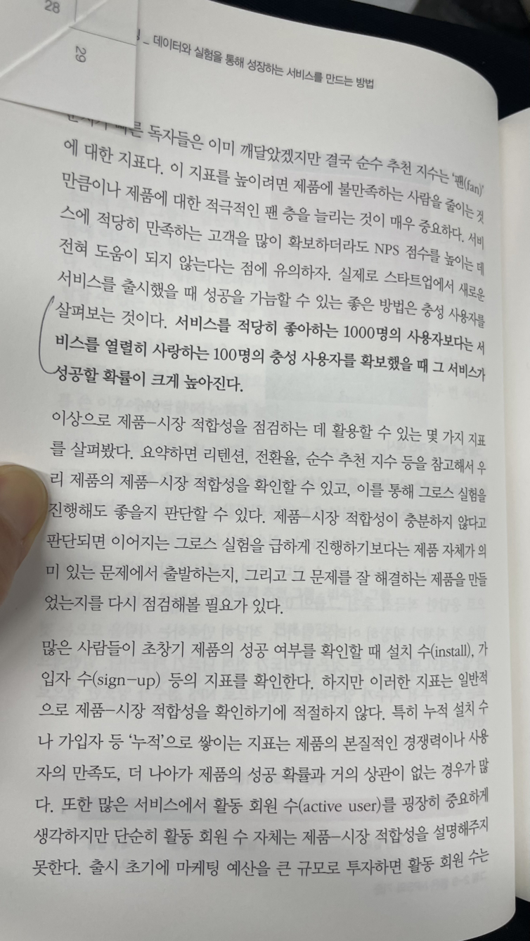 그로스해킹의 시작점에는 고객에 대한 이해가 있다. 그리고 이를 기반으로 고객이 내가 만든 프로덕트를 좋아하는지 알아야 한다. 내가 만든 프로덕트를 무척 좋아하는 유저 100명이 있어야, 초기에 양질의 피드백도 얻을 수 있고, 더욱 깊어진 고객 이해를 통해 더욱 깊은 문제를 해결할 수 있다.