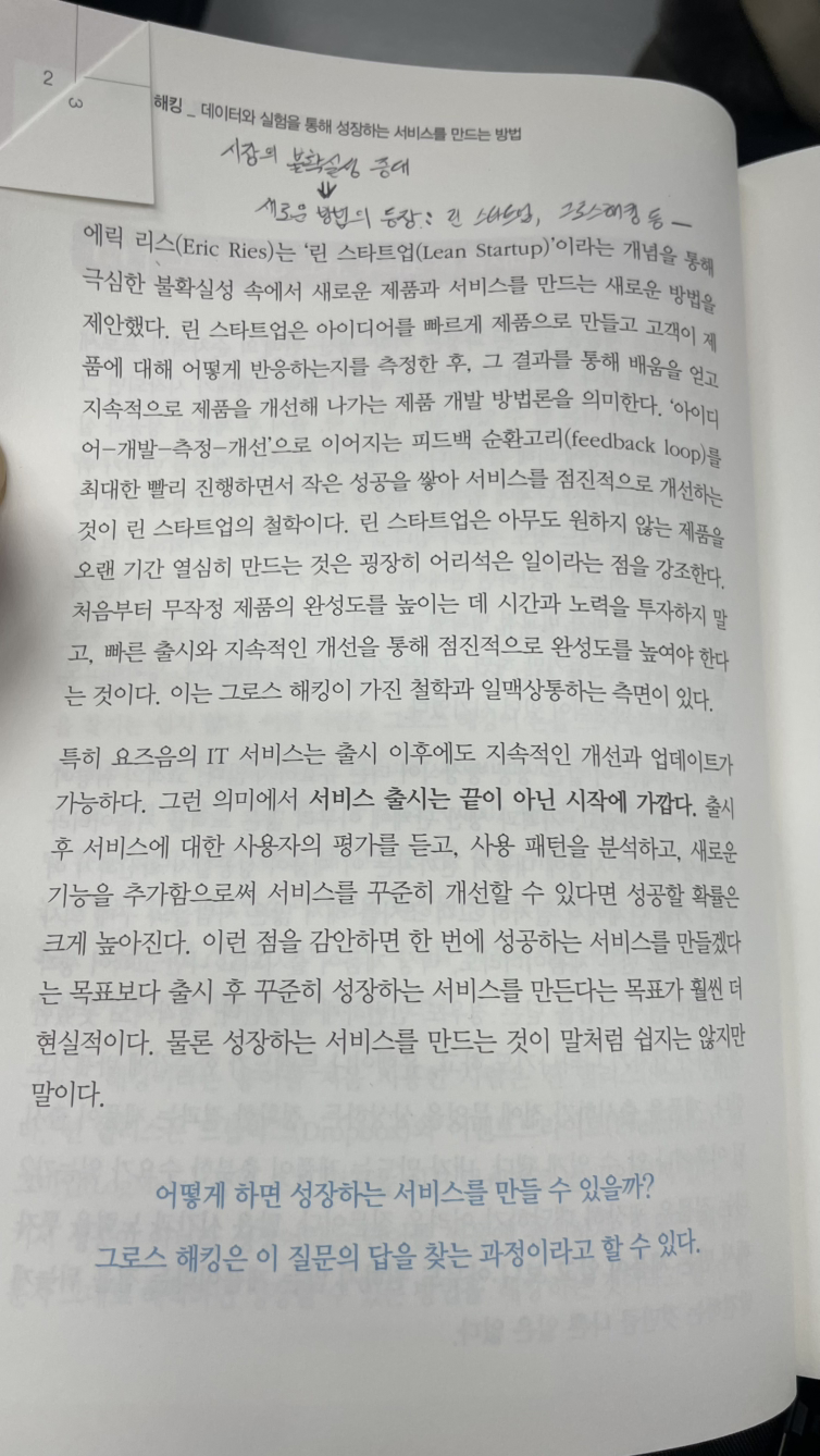 어렵다는 것. 그렇기에 이에 걸맞는 새로운 방법-그로스해킹 혹은 린 스타트업 방법론이 필요하다. 그로스해킹은 적은 자원으로 다양한 시도를 하여, 실제로 시장에 먹힐 수 있는 서비스/기능을 찾거나 그 서비스/기능이 성장하도록 한다는 점에서 매력적인 대안이다.