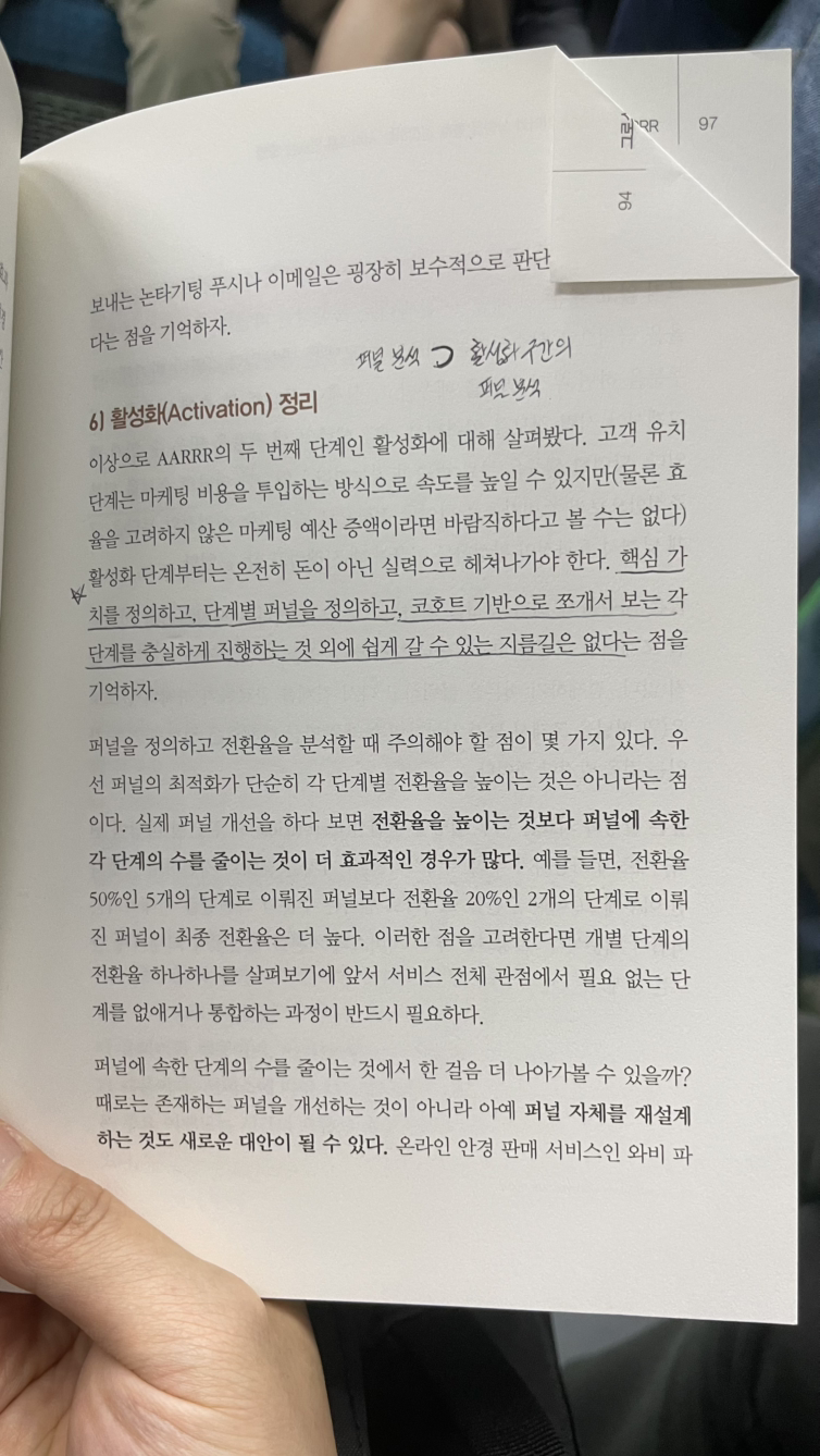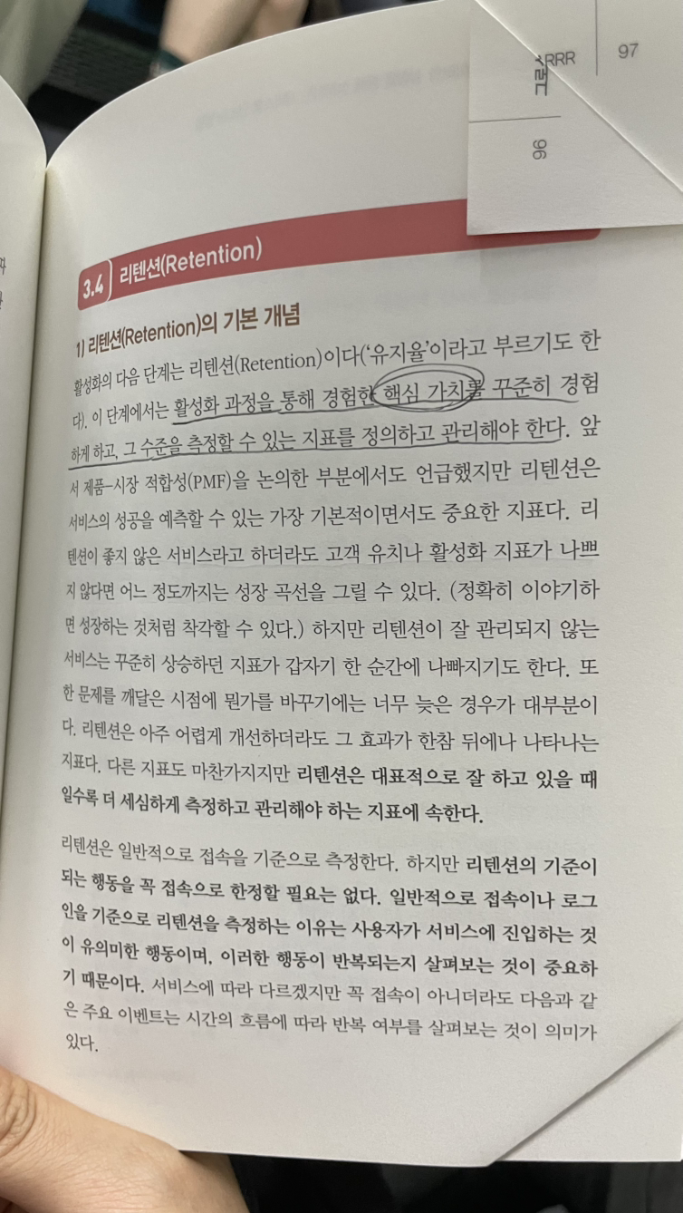 AARRR의 두번째 A, 활성화 과정 퍼널 분석은 유저가 핵심 가치를 느끼도록 하는 여정까지 잘 나아갈 수 있는지 확인하는 것, 그 다음 R 리텐션은 유저가 계속해서 그 핵심 가치를 느끼고 있는지 확인하는 것이다.
