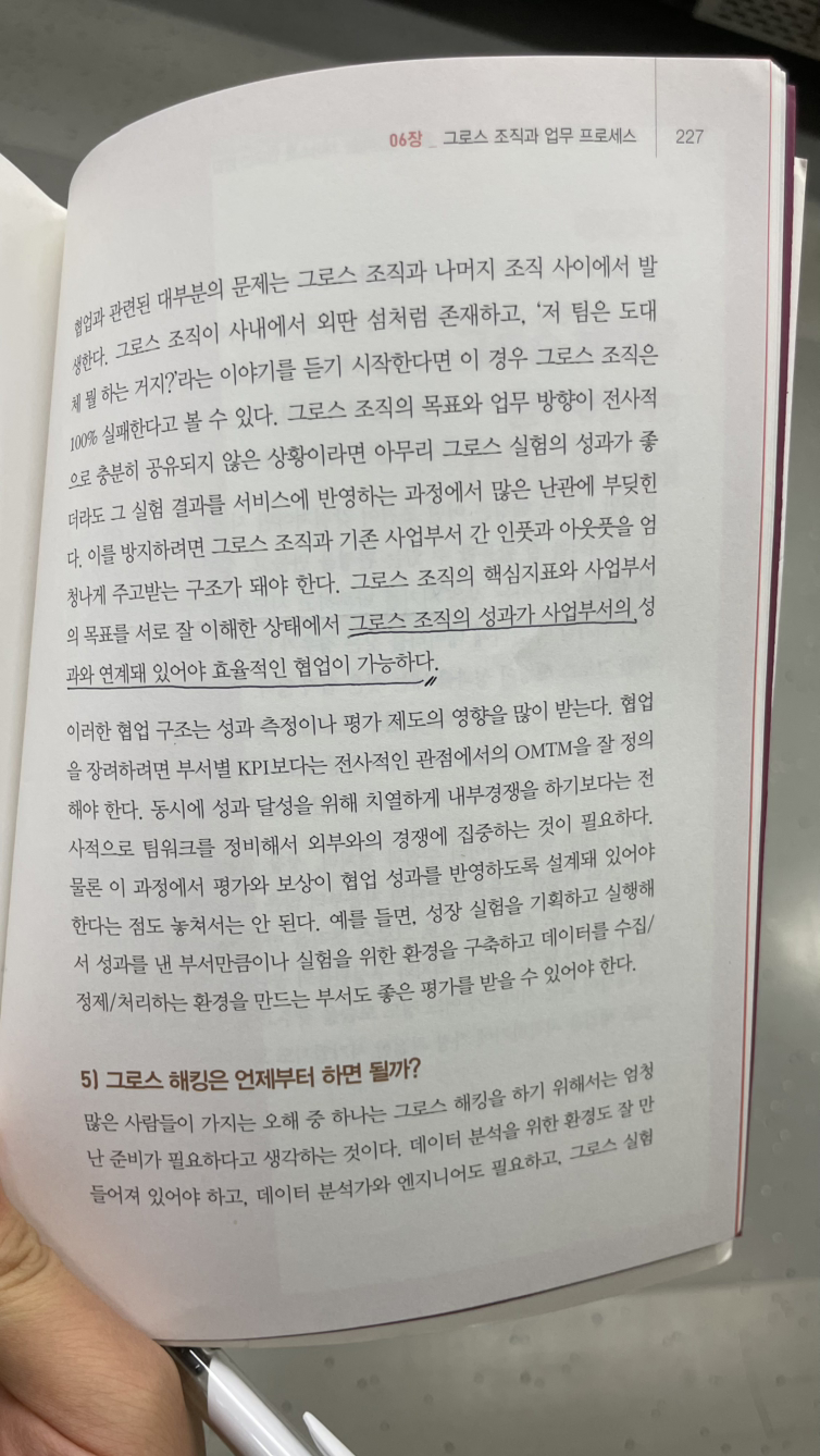 그로스 팀을 만들고 그로스를 구현하기 위해서는 여러 현실적인 구체적인 실천이 필요하다. 경영진의 조력, 제품 개발과의 보완적 관계 형성, 그로스 성과를 사업부서 성과와 연결하는 것 등.