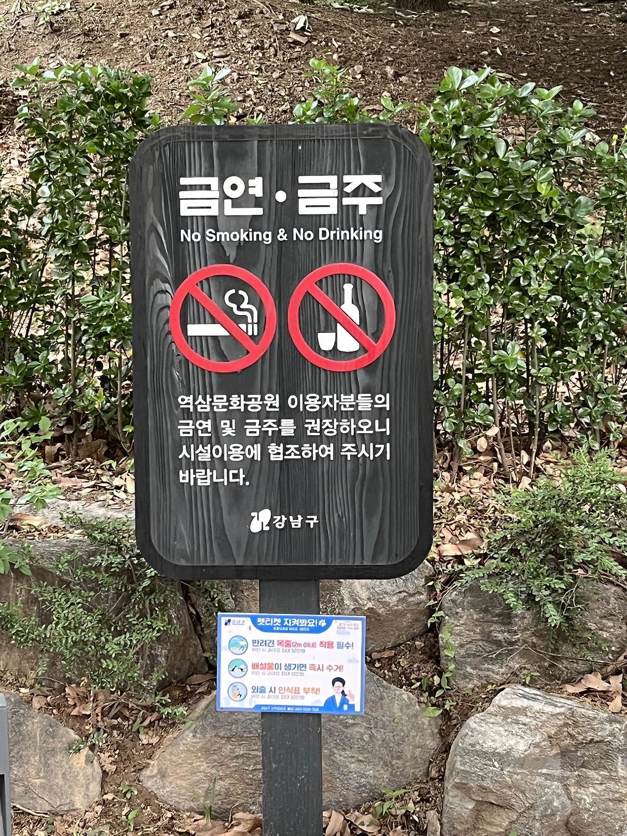 역삼문화공원으로 올라가는 방법은 여러 가지가 있을 수 있다. 11번 출구에서 골목길로 곧장 들어가 먹자골목 안쪽으로 약간만 올라가면 바로 역삼문화공원이 나온다. '강남역에 이런 곳이 있었어?' 하는 생각이 들 만한 정도 크기의 공원이고 벤치와 운동기구도 있어 잠시 시간을 보내기에도 좋다.