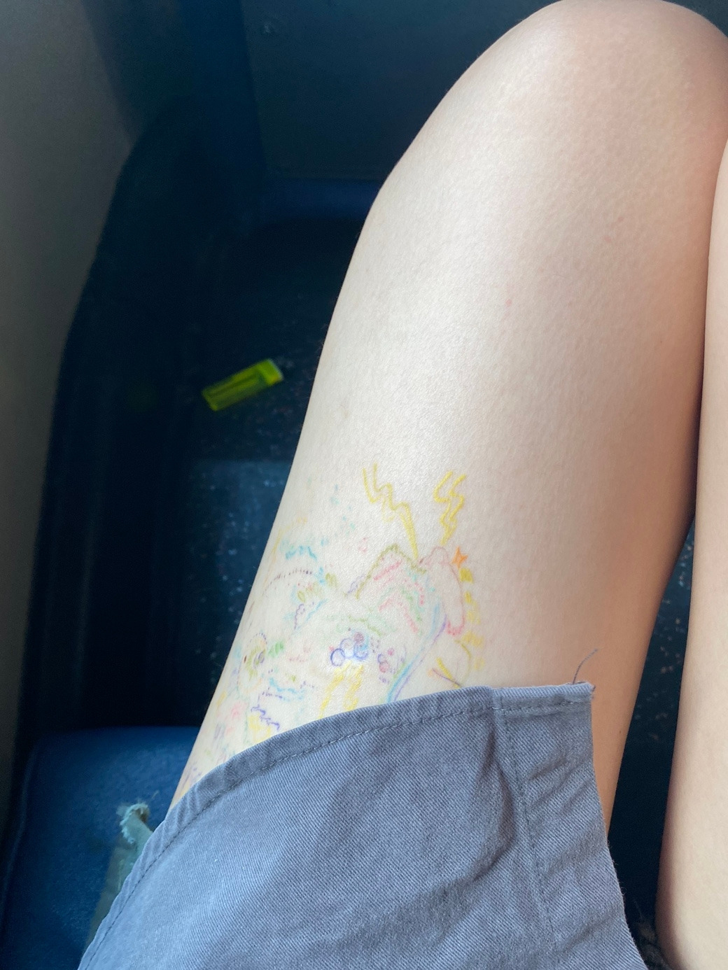 로미는 이 도안을 베를린에서의 경험과 인상을 바탕으로 작업하기 시작했다고 했다. 로미의 과거 속 정신적인 지세를 보고 있는 것 같았고, 어느 아름다운 꿈결의 장면 같았다. 로미를 스치고 간 여러 요소들이 천진하게 어우러져 있는 선들의 덩어리가 마음속에 콕- 박혀 꼭 타투를 받게 해달라고 부탁했다. 로미는 점, 선 하나하나의 요소에 주의를 기울여 내 몸에 새겨주었다. 그날 그녀와의 신비로운 만남에 내가 한 요소가 되고, 의미가 되어가는 특별한 기분이 들기도 했다.