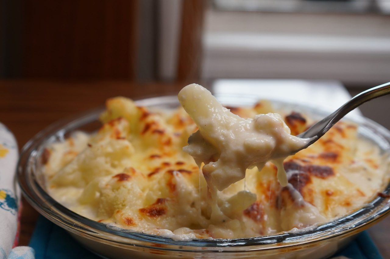 -콜리플라워 with 베샤멜소스: 우유 300ml, 버터 2 tsp, 밀가루 2 tsp, 양파 반 개, 정향, 월계수잎 1/4, 화이트페퍼(블랙페퍼로 대체) 1꼬집, 너트메그 1꼬집, 콜리플라워 반개, 올리브오일 10ml, 파마잔 치즈 40g
