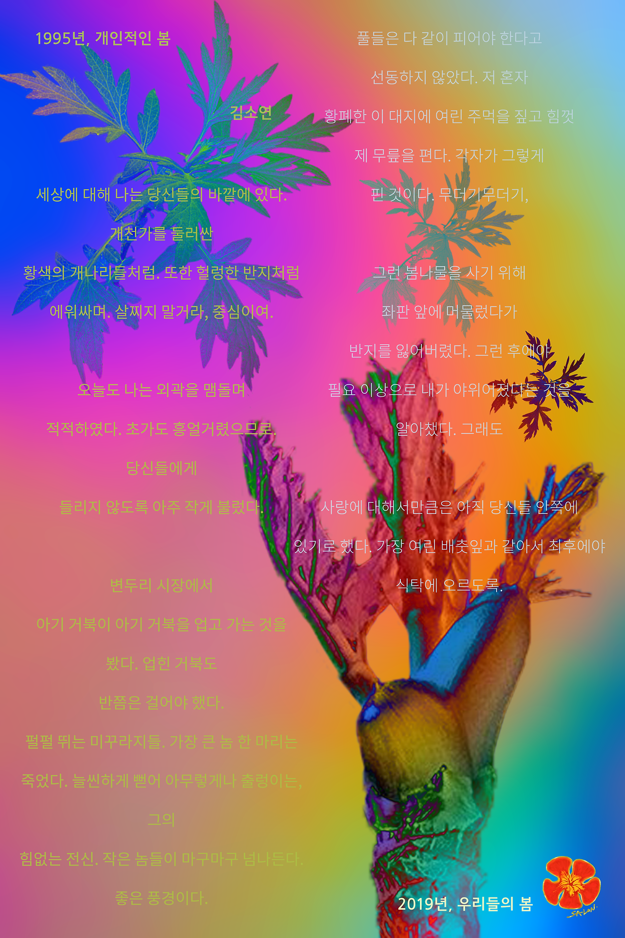 '펄펄 뛰는 미꾸라지, 마구마구, 풀, 선동, 여린 주먹, 봄나물, 여린 배춧잎, 외곽'의 낮은 삶들이 북적이는 오래된 시장통이 떠오르는 단어들, 그래서 민중시같이 느껴지는 이 시에서 나는 봄의 개천가를 흐드러지게 에워싼 황색의 개나리들과 반짝이는 반지를 머릿속에 그려보고 탄성을 내질렀다. 조금은 휘어진 개천가에 피어난 노란 개나리 자국들이 마치 반지의 한 부분처럼 빙돌아 피어있고, 그 개나리 군락처럼 황색으로 빛나는(어쩐지 금반지) 매끈하고 헐렁해서 손가락을 빙빙 도는 시인의 반지가 아른거린다. 찌지 않은 중심을 가진 헐거운 사물에 자신을 비유하고 있는 것 같았다.