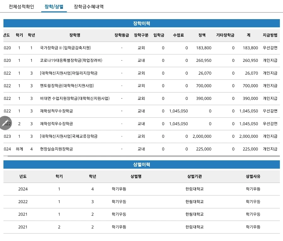 장학금은 이렇게 받았고 주전공은 영어영문학과,