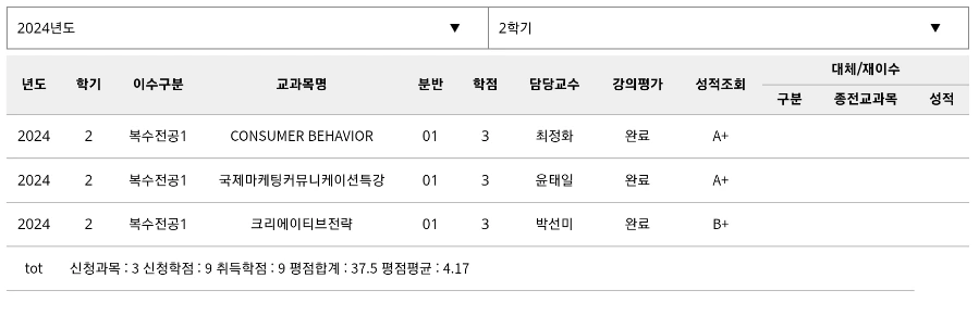 전체 평점 4.15 (교환학생때 성적 합하면 4.14)