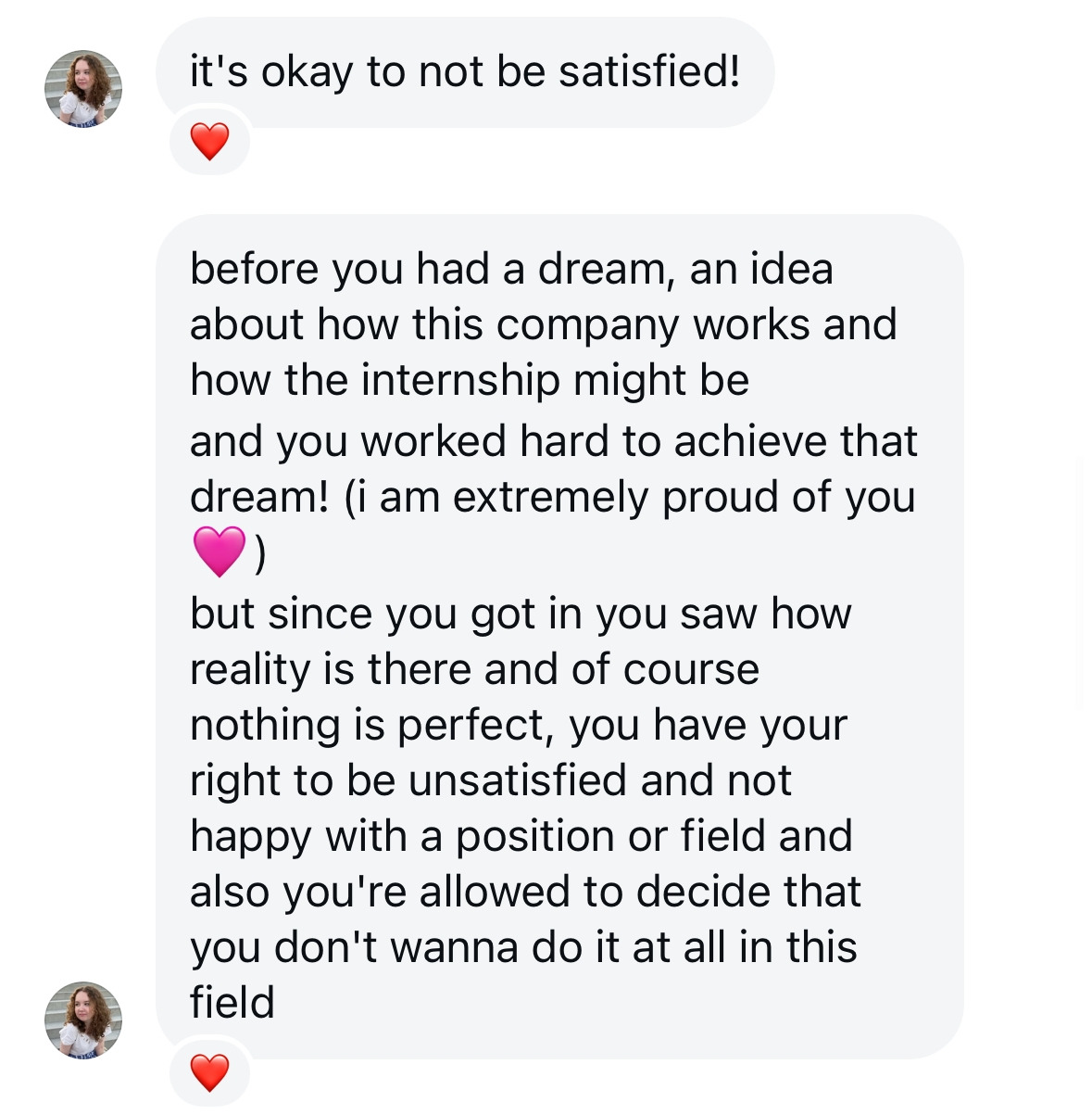 나 요즘 이상해. 정말 오고 싶었던 회사에서 대우받으면서 인턴십을 하고 있는데 어째 만족스럽지가 않아. 나 이 회사에서 인턴십을 하는게 3년간 꿈이었고 분명 모두가 잘해줘. 그렇지만 결국에는 마케팅으로 다시 진로를 정하게 될 것 같은데 어떡하지? 난 한 가지 활동을 오래 못하는 사람이 아닌데. 나 분명 성실한 사람인데 이상해. 나도 내가 왜 그런지 모르겠어.