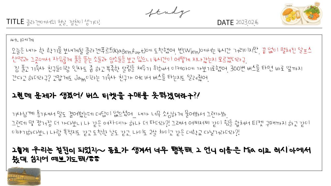 그녀도 오늘 막 클라겐푸르트에 도착했다며, 어떻게 버스 티켓을 사야 할지 모르겠다고 했다. 왜인지 동지애가 생겨 그녀와 함께 어색한 영어와 부족한 독일어를 섞어 함께 현금을 내고 티켓을 사게 되었다.