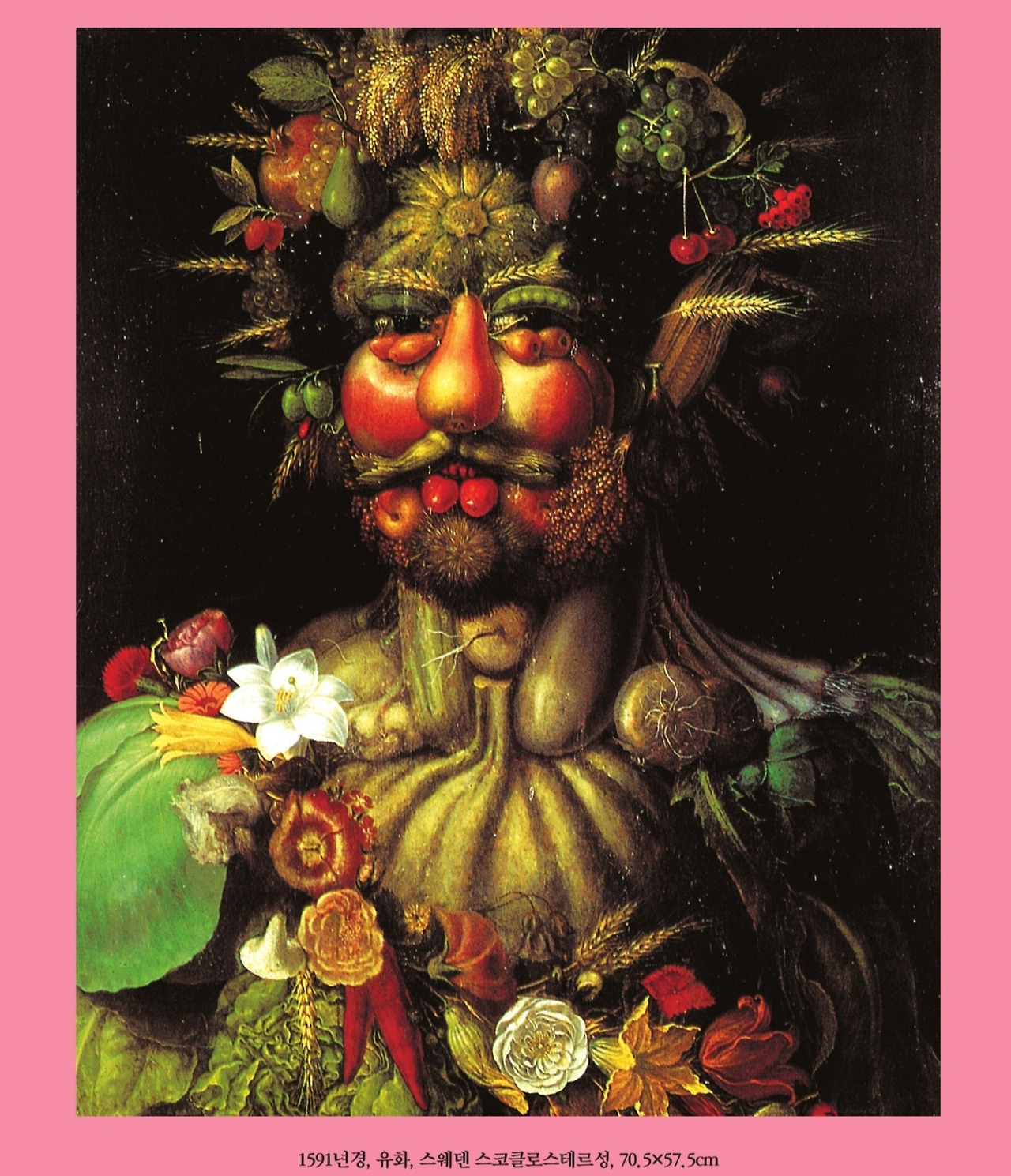 어쨌거나 내가 정리해보자면, 아르침볼도는 동식물, 채소, 과일, 어패류, 책 등을 세밀하게 조합해 인간의 얼굴처럼 보이게 하는 '합성 안면상'을 제작하는 것으로 유명한데 합스부르크가 최고의 기인이라고도 불렸던 루돌프2세는 당시 유럽에서 쉽게 접할 수 없던 동식물. 점성술과 같은 요소들에 관심이 많았고 아르침볼도의 합성 안면상은 그러한 그의 마음을 빼앗기에 충분했다.