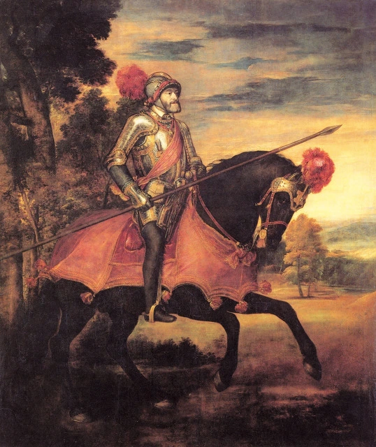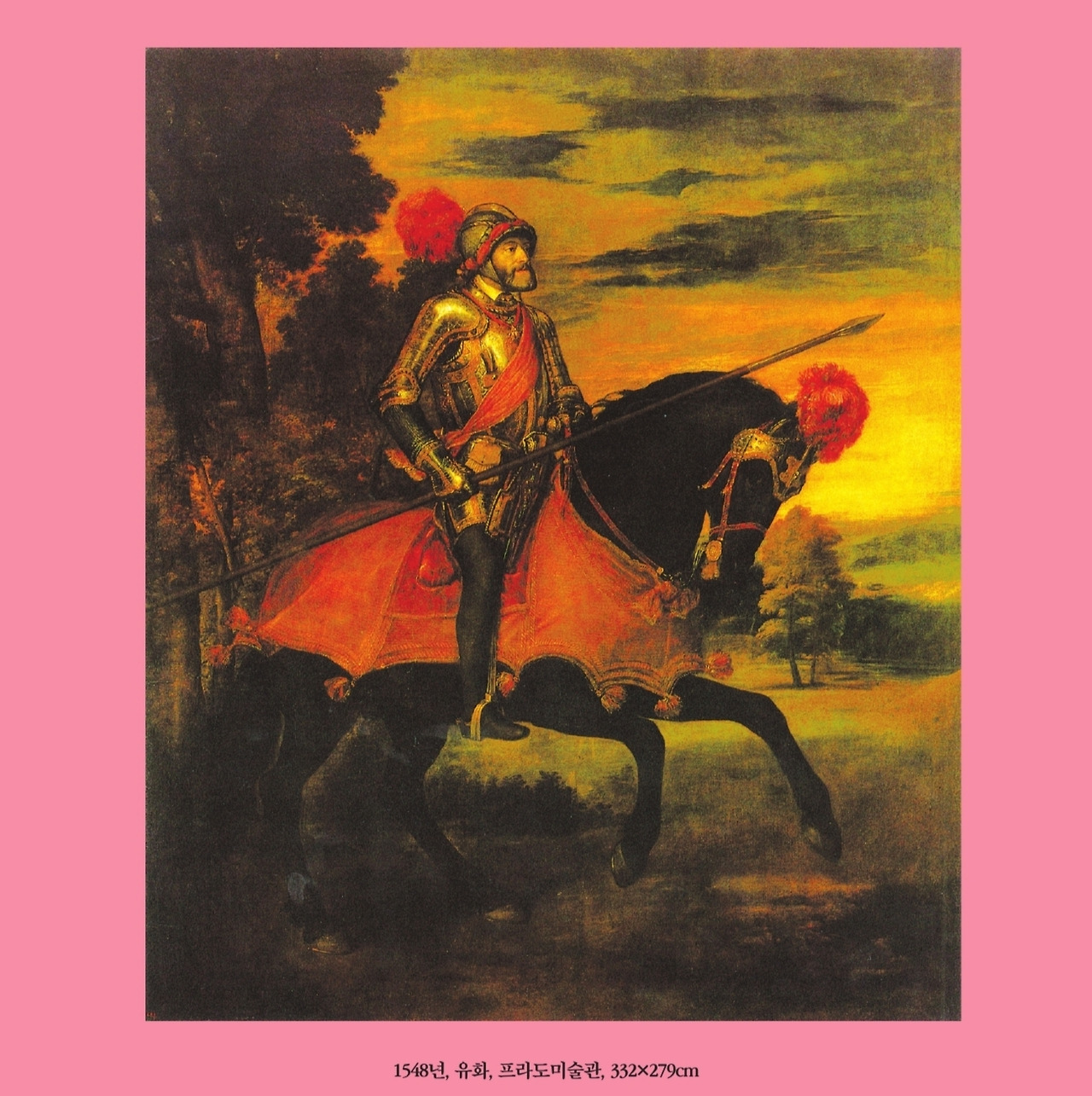 베첼리오 티치아노가 등장할 차례! 카를 5세는 30대때 이탈리아에서 이 위대한 화가의 작품을 처음 접하고 '색의 베네치아파'다운 풍부한 색채, 정교한 사실적 묘사와 온화한 화풍에 완전히 마음을 빼앗겨 그 뒤로 줄곧 자신과 가족의 초상화를 의뢰했다고 한다. 이 이탈리아인 화가는 여전히 자신이 태어난 베네치아에 머물고 있었지만, 다음 대 펠리페 2세까지 부자 2대에 걸쳐 에스파냐 궁정화가로 지내며 연금도 받았다고 한다.