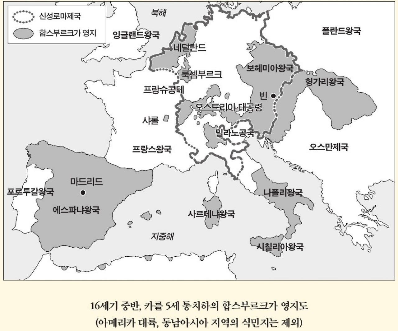 카를로스 1세는 19세에 신성로마 황제의 자리에 올라 카를 5세가 되었다. 이는 뜻밖의 고전 끝에 얻은 결과로, 카를 5세는 40년의 치사 중 독일 9번, 이탈리아 7번, 프랑스 4번, 영국 2번, 아프리카 2번 등 총 40차례나 전쟁터로 나갔다. 카를에게 "오직 전쟁에만 몰두했다."는 수식어가 붙은 것도 전혀 과장이 아닐만하다. (구체적인 내용은 책을 확인하기를 바란다.)