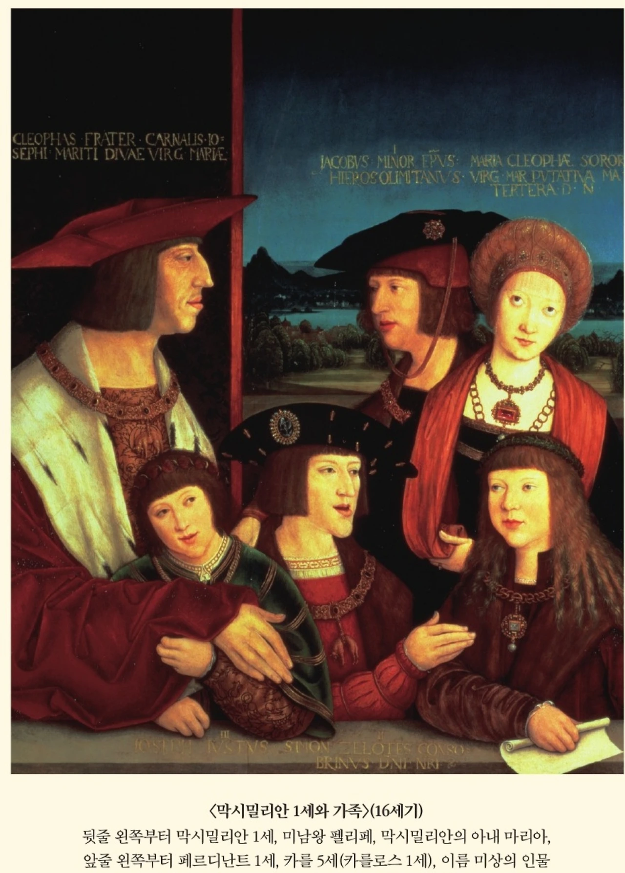 유전병의 사례로 유명한 '합스부르크의 주걱턱과 아랫입술'에 대해 여기서 잠깐 다뤄보려 한다. 당시 무명화가가 그린 <막시밀리안 1세와 가족>이라는 그림을 보면 이해하기 쉽다. 뒷줄 왼쪽 붉은색 팔레트를 쓴 왕이 막시밀리안 1세이다. 옆모습이라 매부리코와 부정교합이 확연히 눈에 띄고 뒤러의 초상화와는 전혀 다른 사람같다. 그 옆에 검은색 팔레트를 쓴 사람이 후아나가 격렬히 사랑했던 미남왕 펠리페이고, 오른쪽이 막시밀리안 1세의 비 마리아다. 앞줄 왼쪽은 막시밀리안의 손자이자 오스트리아의 합스부루크 가문을 계승한 페르디난트 1세이다. 오른쪽 끝에 있는 인물의 정체는 여러 설이 분분한데다, 남자인지 여자인지도 의견이 갈린다고 한다.