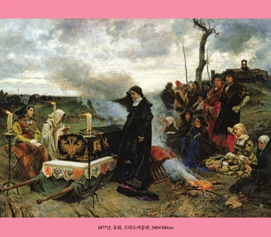 그런데 사람들의 표정은 고인을 기리는 슬픔이 아니라 이제는 그만하고 싶다는 듯한, 질려버린 듯한 표정이다. 과연 이 그림이 담고 있는 역사는 무엇일까? 검은 옷을 입은 여주인공의 비통함과는 대조대는 주변인들의 반응은 왜 연출된 것 일까? 왜 조금만 더 가면 있는 언덕 위 수도원까지 가지 않은걸까?