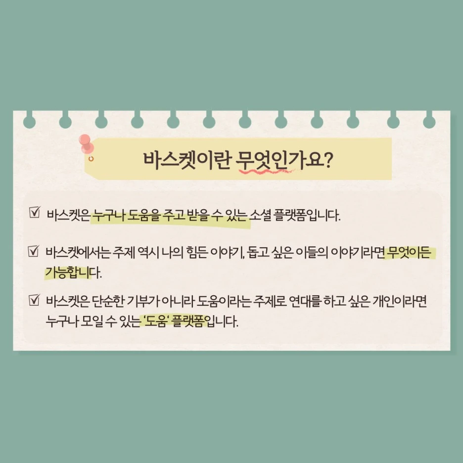 : 바스켓은 누구나 도움을 주고 받을 수 있는 소셜 플랫폼입니다.