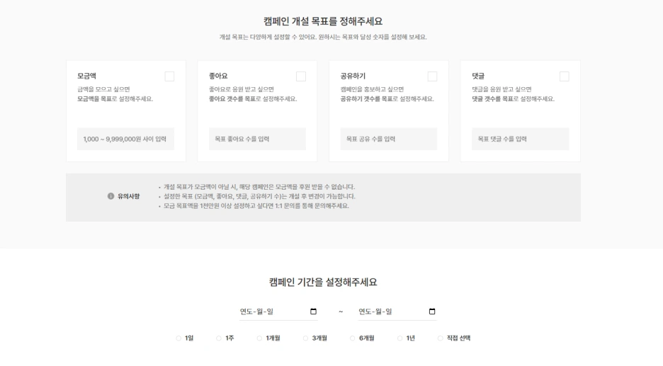 기간이랑 목표 (좋아요, 댓글, 공감 후원금 등등)를 설정해주세요~