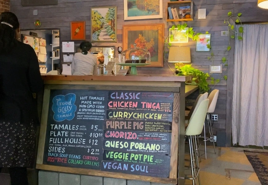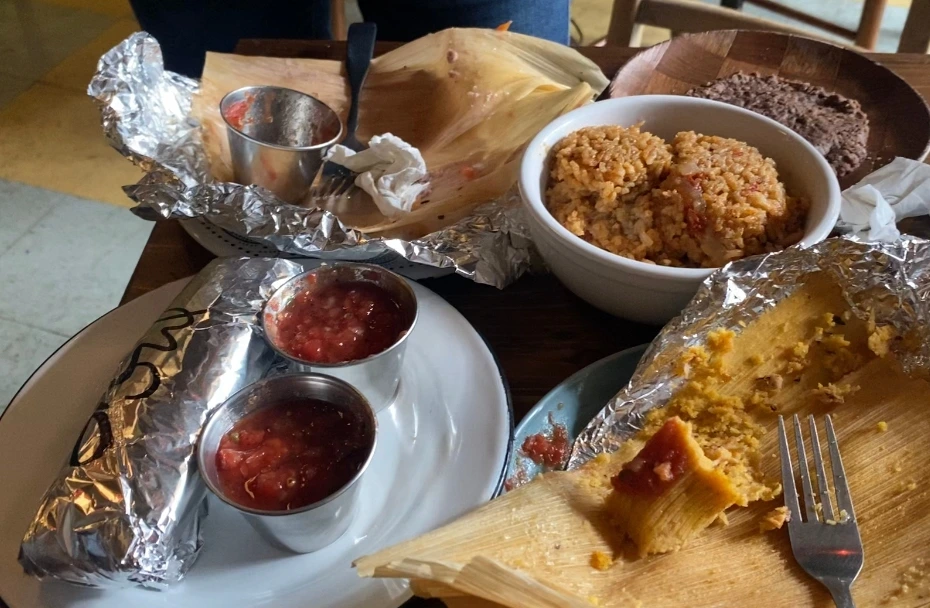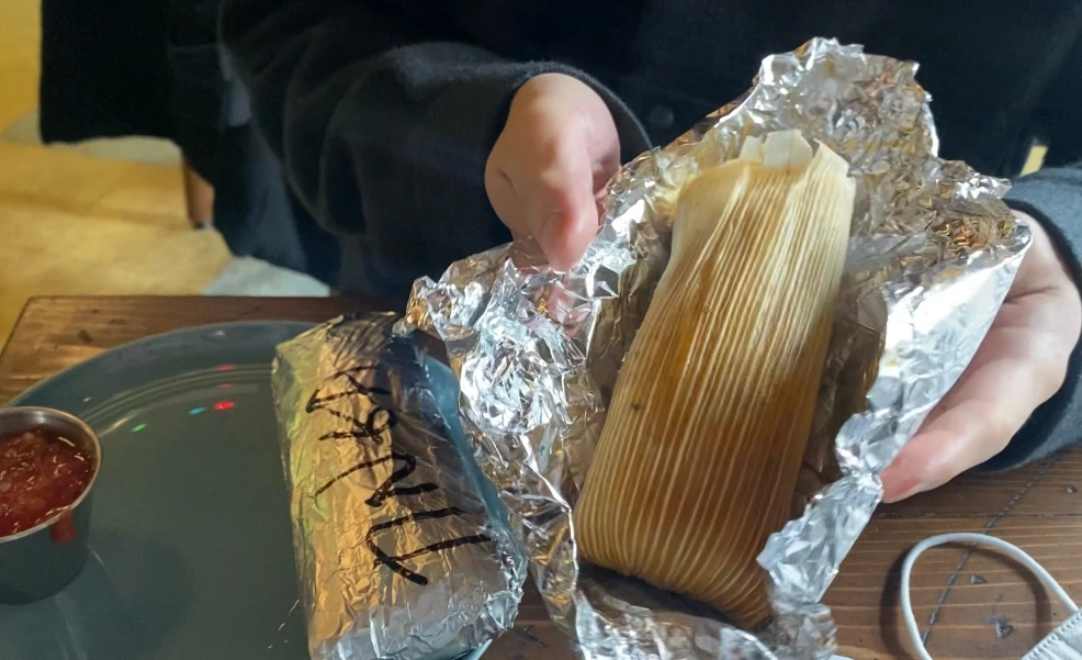 주변에 먹을 것을 찾다가 '타말리'라는 것을 발견했다. GOOD GOLLY TAMALE 이라고 적혀 있어 사실 타말 이라고 불리는 줄 알았는데 나중에 스페인 사람인 엘레나에게 불어보니 아~ 타말리스~?하고 말해주었다. 리뷰가 좋아 처음 들어보는 음식이지만 시도해보러 갔다. 입구에 들어서는 순간부터 비건 식당들에서 종종 풍겨오는 얼터너티브한 바이브가 물씬 느껴져 여긴 찐이라는 예감이 들었다. 뉴욕에 있다가 오니 이런 것이 하나에 5달러 한다는 게 너무 감사했다. 우선 사이드 없이 타말리만 세개를 시켜보았다. 치킨팅가, 베지팟파이, 하나는 기억이 안난다. 음식이 나올 때까지도 어떤 음식인지 몰랐고 랩에 싸여진 타말리를 열고 옥수수껍질에 싸인 것을 보고 신기해했다. 그리고 우리나라의 찐빵의 기다란 버전처럼 각 재료가 옥수수전분반죽에 싸여있었다. 남자친구가 한 입을 먹더니 너어무 맛있다고, 맨날 먹고 싶다고 너무 좋아해서 어떤가 먹어보았다. 짜지 않아 좋았고, 부드러워 좋았다. 그리고 무엇보다 토마토 살사가 너무 싱싱하고 맛있어서 살사가 큰 몫을 한 것 같았다. 세개를 허겁지겁 해치우고 추가 주문을 했다. 밥도 먹고싶어서 사이드 밥과 비건소울 맛 타말리, 민트초코쿠키를 추가했다. 행복한 식사였다.