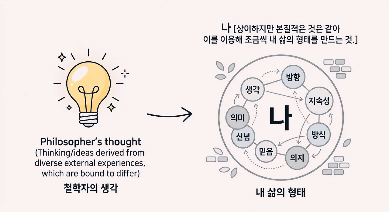 철학자의 생각 (상이할 수밖에 없는 외부경험으로부터의 도출) ➔ 자기 자신 [상이하지만 본질적은 것은 같아 이를 이용해 조금씩 내 삶의 형태를 만드는 것.]