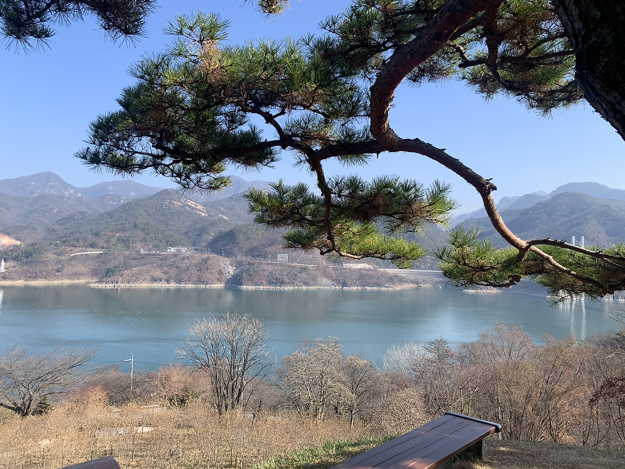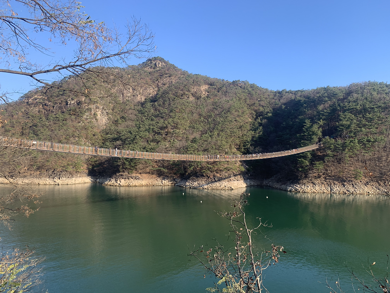 기사님이 추천해줬던 명소. 내 인생 최초의 출렁다리였다. 정말 말 그대로일 줄은 몰랐다. 가운데는 투명해 물빛이 다 보이고 다리는 엄청 흔들거렸다. 그래서 다리를 건널 때는 풍경이고 뭐고 여유롭게 감상할 틈이 없었다. 다 건너고 나서야 풍경이 눈에 들어왔다. 충주호의 위엄을 다시 한번 확인할 수 있었다. 초록빛으로 물든 지금이라면, 더욱 아름다울 것이다.
