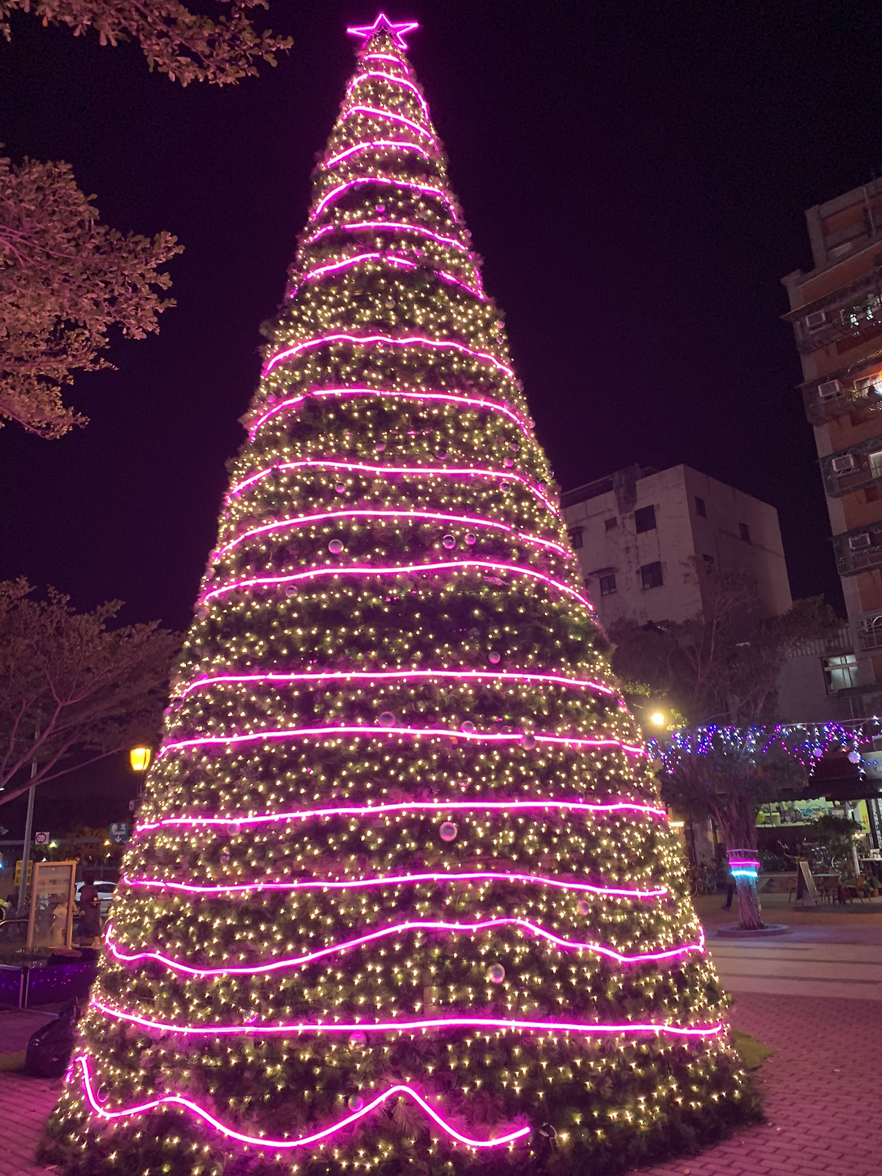 아쉬운 대로 강변을 살짝 걷다가 다시 호텔로 돌아가기로 했다. 그렇게 단수이와의 만남이 허망하게 끝나는 줄 알았는데... 반짝이는 조명이 켜진 공원을 발견했다. 예쁘게 켜진 조명 사이에서 사진을 찍다가 역으로 돌아가는 길에는 커다란 트리까지 만났다. 방문 당시, 크리스마스를 코앞에 둔 덕인지 거리 곳곳도 형형색색의 조명들이 가득했다.