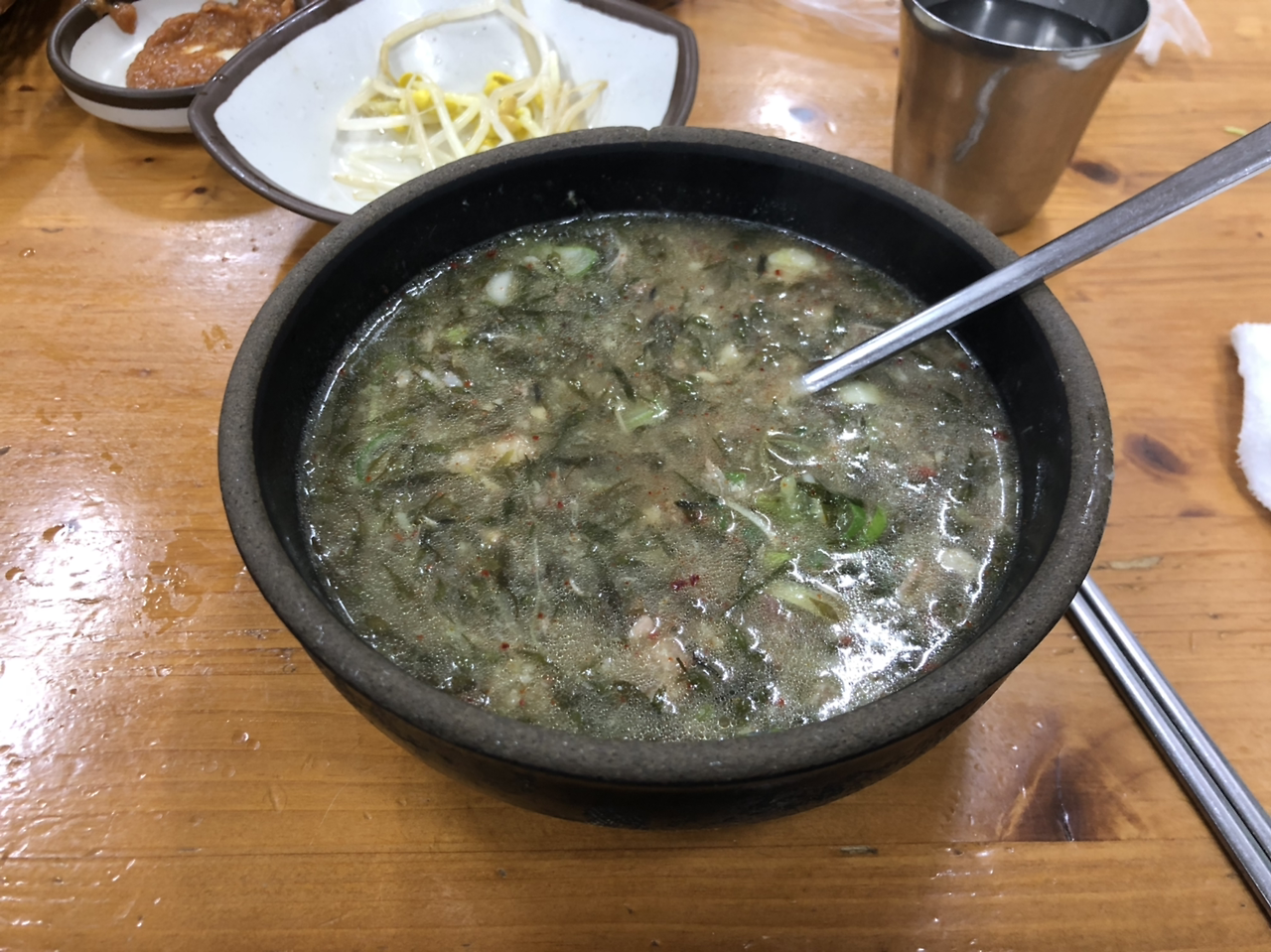 물론 아예 특징 없는 맛은 아니다. 해초가 들어있기에 약간의 씹는 맛도 있고, 내륙에서 해장국과는 다른 느낌이 든다. 아예 해초만 들어있는 것은 아니고, 중간중간 고기도 씹히고.. 국물과 모자반, 고기의 조화가 상당하다.