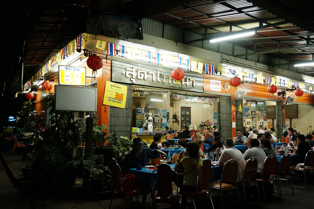 마지막 일정은 수다 식당이다. 수다는 스쿰빗 쏘이 14에 위치한 식당으로 바나나 잎에 싼 치킨이 별미로 매우 유명하고, 그 외의 메뉴도 평균 이상은 하는 곳이다. 나는 특히 바나나 잎 치킨을 좋아하기 때문에 저녁 식사를 여기서 하기로 했다. 우리는 앉자마자 바나나 잎 치킨과 밥, 그리고 새우와 야채 모듬 튀김을 시킨 뒤 시원한 땡모반을 추가했다.