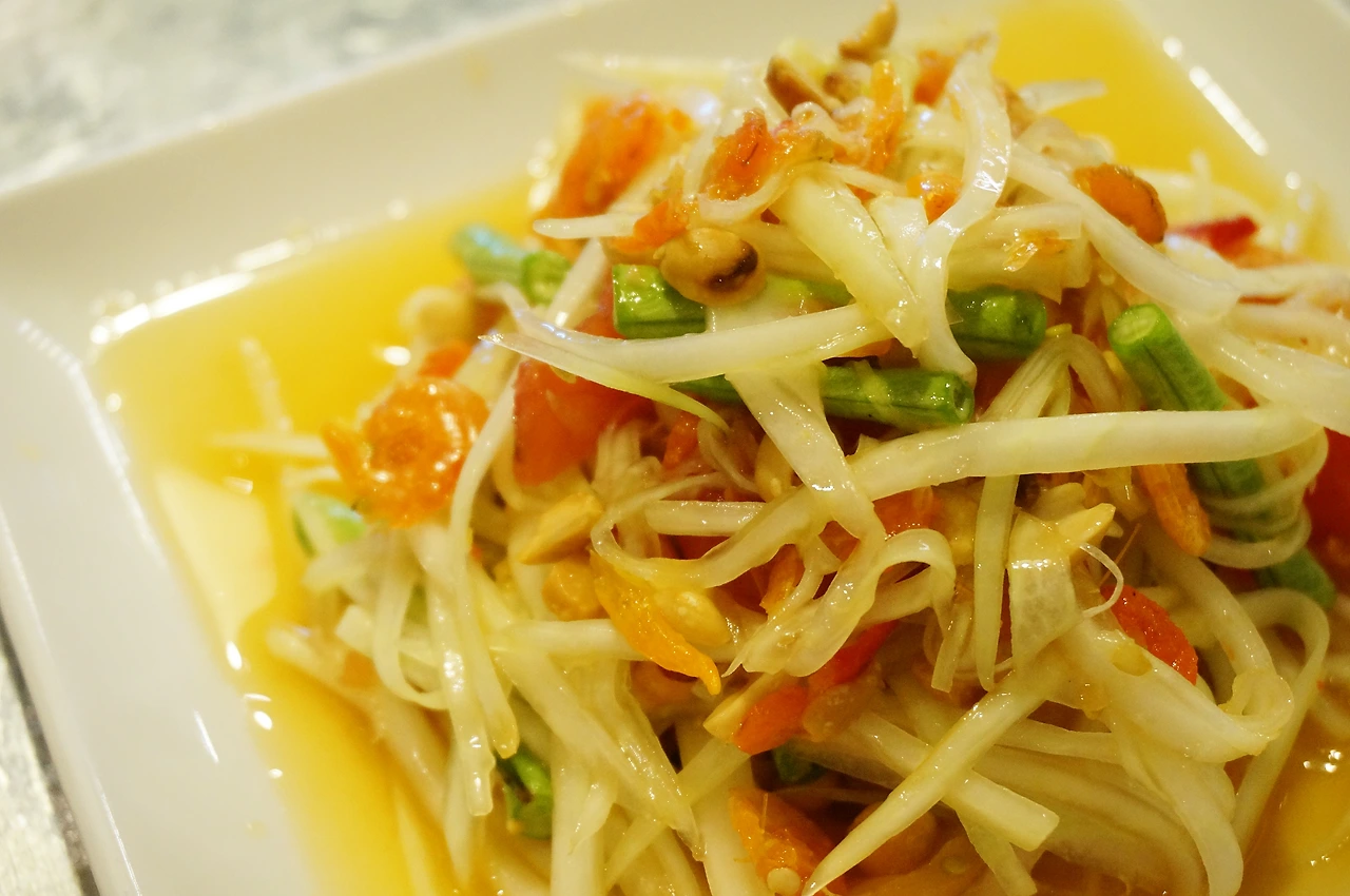 까이텃은 우리가 먹는 한국산 후라이드 치킨보다 바짝 튀겨 낸 닭 요리로 쫄깃하고 톡톡한 식감이 돋보인다. 나는 한 입 베어 물면 입가에 기름이 잔뜩 묻는, 소위 한국식 시장 치킨부터 기름을 제거한 구운 치킨까지 모두 가리지 않고 잘 먹는 편인데 까이텃은 튀긴 치킨 치고는 덜 기름지고 담백한 맛이라 부담이 없다. 식감 역시 늘큰하다기보다 쫄깃쫄깃한 편이고. 게다가 더운 나라의 요리는 대체로 간이 센 편이지만, 쏨땀누아의 까이텃은 교촌치킨 등 한국서 유명한 간장 치킨과 비교하면 그다지 간이 센 편도 아니라 편하게 먹기 좋다. 닭이 워낙 작고 날개와 봉 위주로 나오는지라 발라 먹는 것을 귀찮아하는 사람이라면 딱히 좋아할 만한 요리는 아니지만, 나는 닭을 발라 먹는 것도 좋아하고 날개와 봉은 더 좋아하므로 까이텃을 맛있게 냠냠 해치웠다.