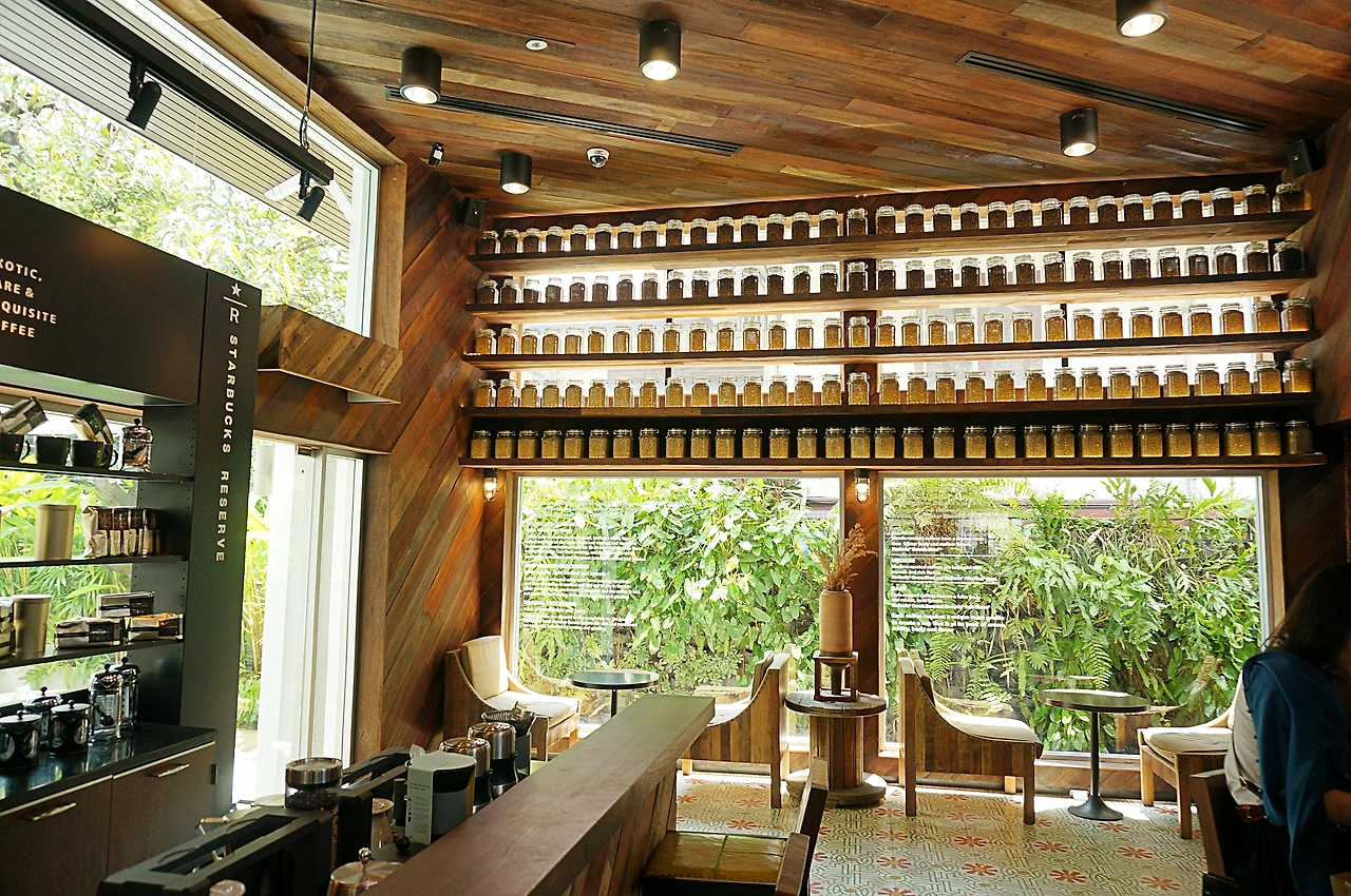 랑수언 로드의 스타벅스는 그런 의미에서 완벽히 내가 사랑할 만한 장소였다. 높은 층고에, 긴 벽을 가득 채운 MD 상품 진열대와, 부드럽게 톤 다운된 컬러로 공간을 분리하는 가벽까지. 이곳은 넓진 않지만 층고가 높은 데다 효율적인 공간 활용 덕분에 상당히 넉넉해 보이면서도 위치에 따라서 아늑한 느낌을 준다. 구석구석 빨대와 시럽 등을 나무 동이 위에 올려두고 천장에 가까운 벽에는 커피콩이 담긴 병을 붙여두는 등 감각적인 인테리어가 돋보이기도 했고. 나와 최언니는 구석구석을 돌아보며 감탄을 아끼지 않았다.