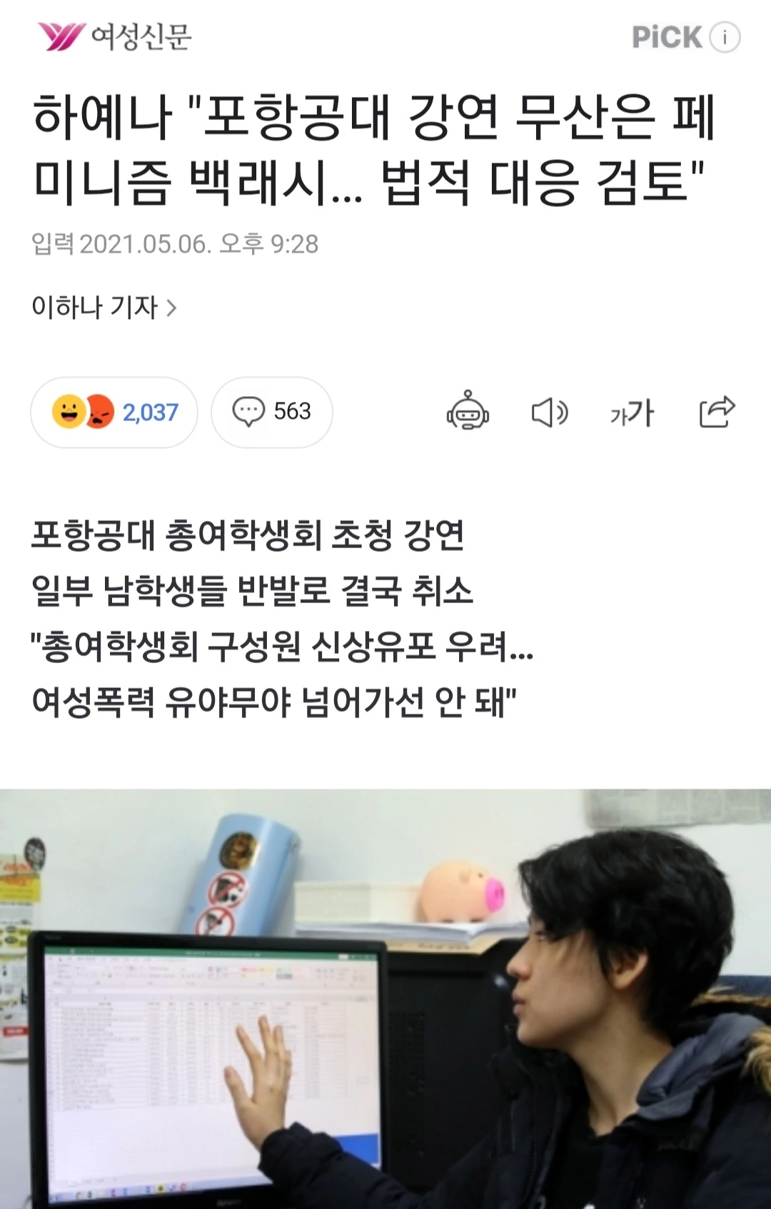 포항공대 총여학생회의 초청을 받고 강연을 하려다 남학생들의 극렬한 반발로 강연 자체가 직전에 취소된 일이 있었다.