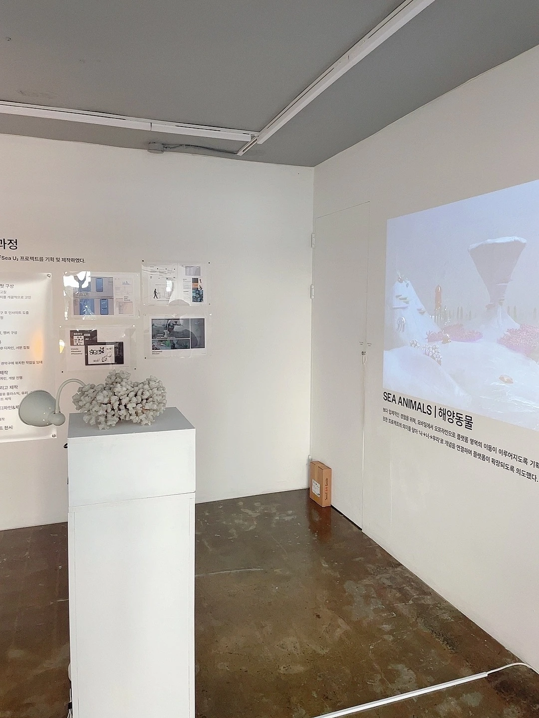 전시 공간은 두 개로 나누어져 있습니다. 바깥 공간에는 전시 의도와 내용이 소개되어 있고 복도를 통해 들어가는 안쪽 공간에는 오브제가 설치돼 있습니다.