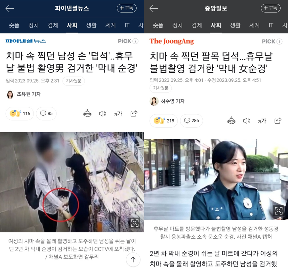 B. "치마 속 찍던 팔목 덥석... 휴무날 불법촬영 검거한 '막내 女순경'" (중앙일보, 23.09.25)