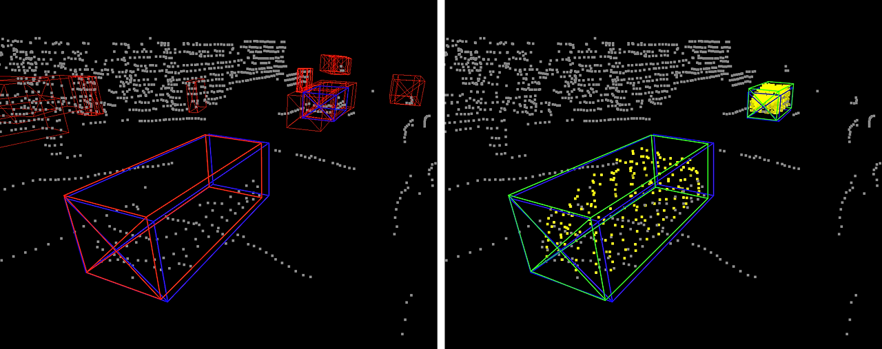 빨강 - 1단계 검출 결과 (관심 영역) / 노랑 - 포인트 생성 결과 / 초록 - 2단계 검출 결과 / 파랑 - 정답 경계 상자