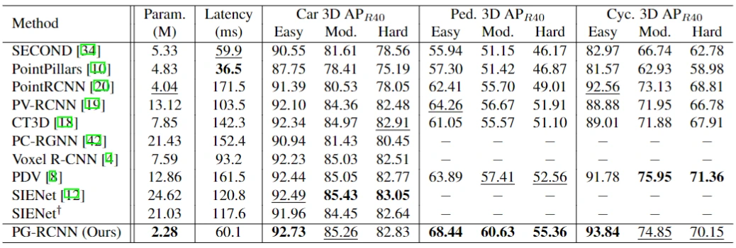 왼쪽부터 두 열 (Parameters, Latency)은 모델의 효율성을 나타내는 척도로 낮으면 좋고, 나머지는 각 범주에 대한 검출 난이도에 따른 정확도로 높을수록 좋습니다. PG-RCNN이 모든 지표에서 가장 좋다고 볼 수는 없지만, baseline Voxel R-CNN보다 모델의 크기는 3배 작으면서 조금은 더 나은 성능을 보유하고 있습니다. 모델 설계에서 파라미터 수를 크게 낮춰서 실행 속도는 1단계 검출 모델에 비견할 수준이고요. SIENet보다는 모델 크기가 11배 이상 작고, 실행 속도도 2배가량 빠른데요. 물론 SIENet보다는 Car에서 조금 성능이 떨어지긴 합니다만 이는 SIENet이 고도화된 1단계 검출 방법을 사용하기 때문입니다. 1단계 검출 방식을 저희와 동일하게 설정하면 저희 모델보다 낮고, Voxel R-CNN에 비견하는 수준입니다. SIENet의 성능 향상이 Point Generation에서 비롯되었다고 보기는 어렵다는 점을 미루어 보았을 때 PG-RCNN은 분명 유의미한 성능을 보이고 있다... 고 생각합니다. (사실 정량적 성능 지표가 조금 약해서, 논문이 합격할 수 있을까 걱정이 많았는데 리뷰어들이 아이디어와 방법론의 타당성, 모델의 효율성을 종합적으로 검토해 주신 것 같아요. 다행입니다.)