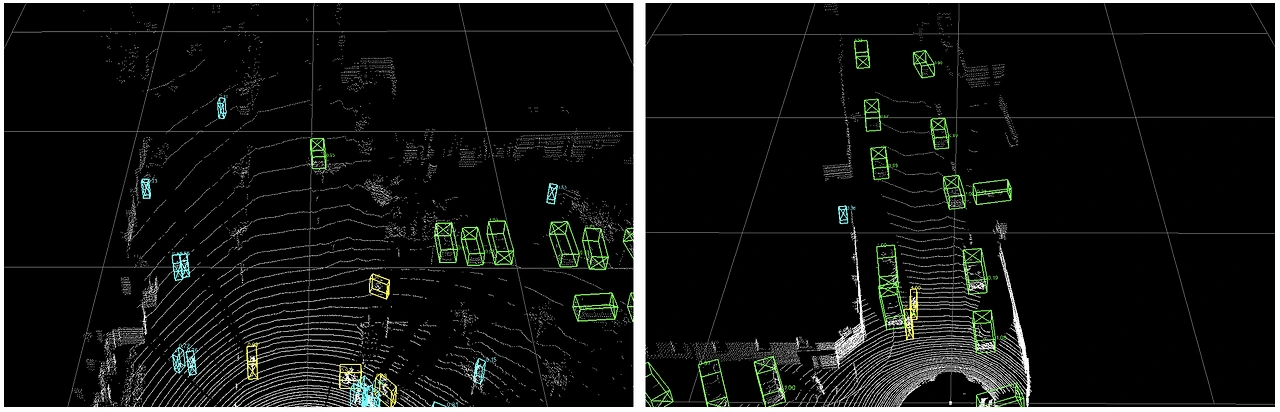 PG-RCNN 역시 SECOND 기반의 1차 예측을 진행하고, Voxel R-CNN에서 사용한 방식으로 RoI 특징을 먼저 등간격으로 추출합니다. 다만 Voxel R-CNN은 추출한 특징으로 곧바로 2차 예측 결과를 내놓는 반면, PG-RCNN은 위에서 소개한 추가 손실함수를 활용해서 RoI Point Generation (RPG) 모듈에서 semantic surface points를 생성하고, 위에서 말한 대로 Detection head에서 생성한 point들을 처리해서 2차 예측을 진행합니다. 그럼 끝! (RPG 모듈 구조의 자세한 설명은 생략하겠습니다.) 여기까지가 PG-RCNN의 구조와 작동 방식 소개였습니다. 긴 설명 따라와 주셔서 감사합니다. 그럼 이제 PG-RCNN의 결과를 함께 보시겠습니다.