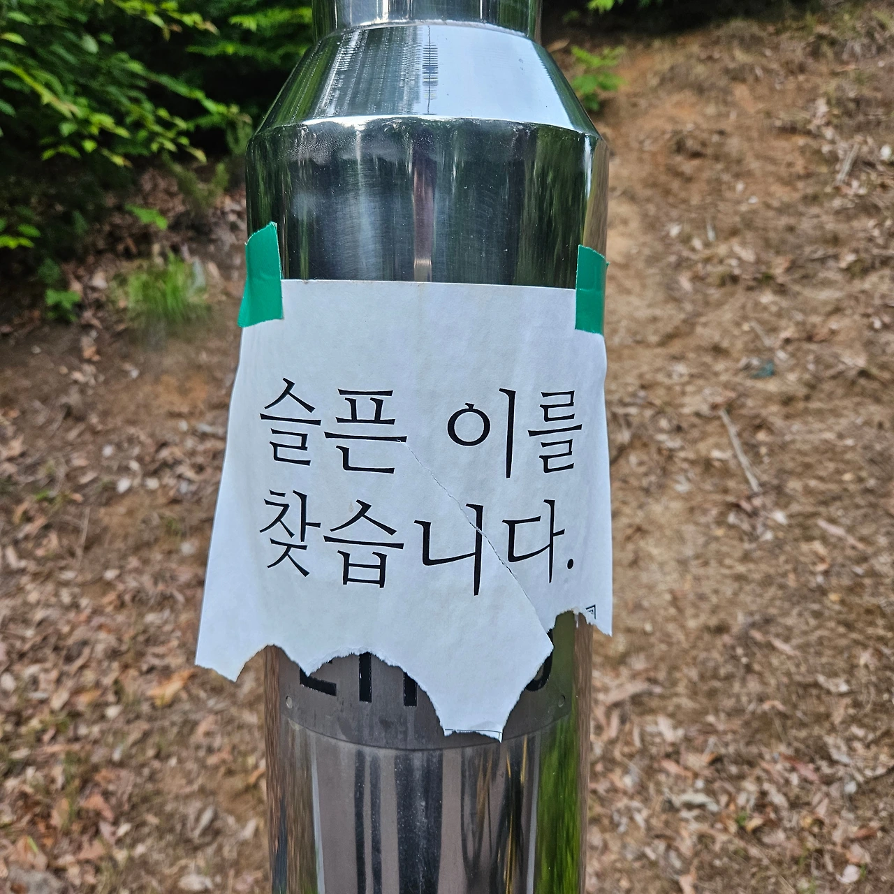 사진의 모든 요소가 마음에 들었다. 어딘지 감도 오지 않는 낯선 배경, 문구의 폰트부터 청테이프, 글자까지 찢겨나간 자국까지. 아마 아파트 단지의 과외 전단처럼 연락처가 적힌 꼬리표가 달려 있었을 것이다. 어쩌면 연락처 대신 다른 문구가 적혀있었을지도 모른다. 짧은 응원이라든가, 자살예방센터의 전화번호라든가. 조금 더 위험한 상상력을 발휘한다면 변태 살인마가 희생양을 찾으려는 것일 수도 있고. 아니면 그냥 능숙한 감성 바이럴 광고거나 근처 학교의 조별과제 설문일 수도 있겠다.