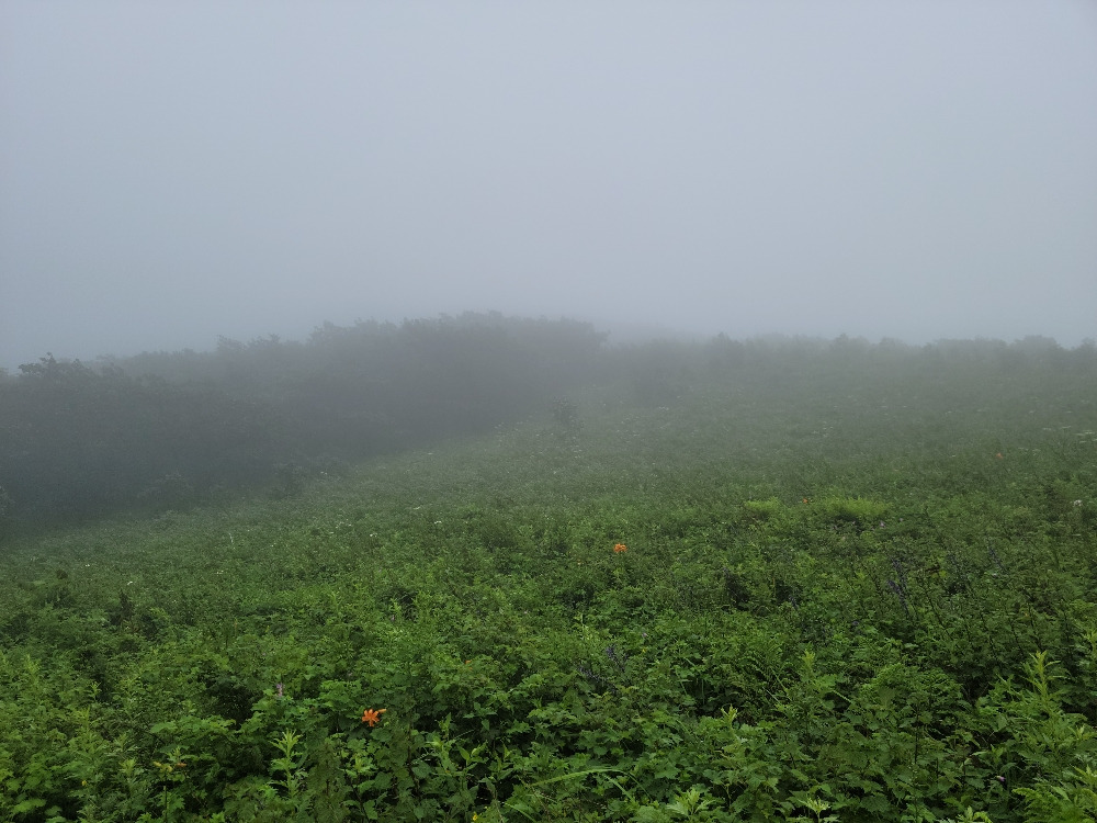 이런저런 생각을 하다 보니 곰배령에 이를 수 있었다. '곰배령 정상'이라고 쓸 뻔했는데, '령(嶺)'이라는 말에 '고개'나 '마루', 즉 하나의 고점(정확히는 saddle point에 가깝지만)이란 뜻이 있으므로 그냥 곰배령. 그곳에 도착하자 또 놀라운 풍경이 펼쳐졌다. 오르는 동안에는 보지 못한 안개가 자욱했다. 마치 구름이 산 사이를 흐르기 위해 모인 것처럼, 희뿌연 증기(정확히는 김에 가깝지만. 차가운 김 ㄷㄷ) 속에 야생화 들판이 펼쳐져 있었다. 그것도 아주 다양한 꽃들이 서로 구분 없이 피어 있었다. 야생화의 melting pot, 하나의 미국(美國)처럼.