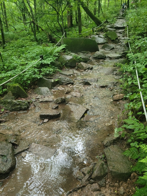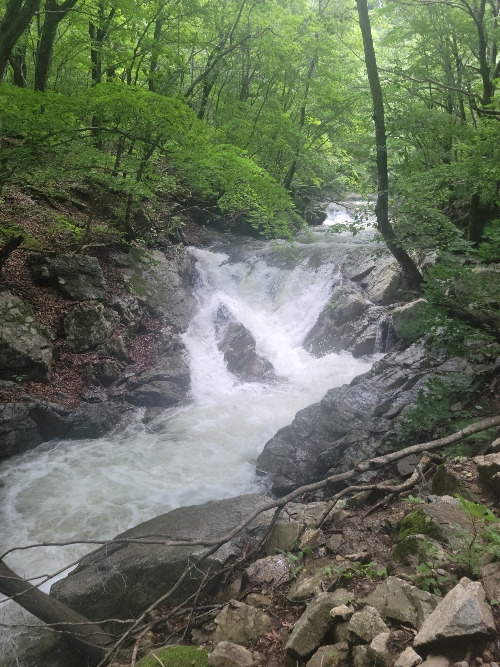 간단히 아침을 먹고 7시 반쯤 숙소를 나섰다. 꼬불꼬불한 강원도 산길을 따라 차로 한참 올라가니 곰배령 초입에 닿았다. 길이 좁고 험해서 뭐 사람들이 많이 오기는 하나 했는데, 금방 산악회 버스가 여러 대 도착했다. 사람이 정말 많았다. (이건 살짝 불호 포인트) 그래도 곰배령 생태숲길은 좋았다. '숲'이라는 이름답게 경사가 심하진 않았고, 옆에 계곡이 우렁차게 흘러서 내내 시원했다. 확실히 비 온 후라 물이 많았던 것 같은데, 덕분에 크고 작은 폭포들이 생겨서 물소리가 좋았다.