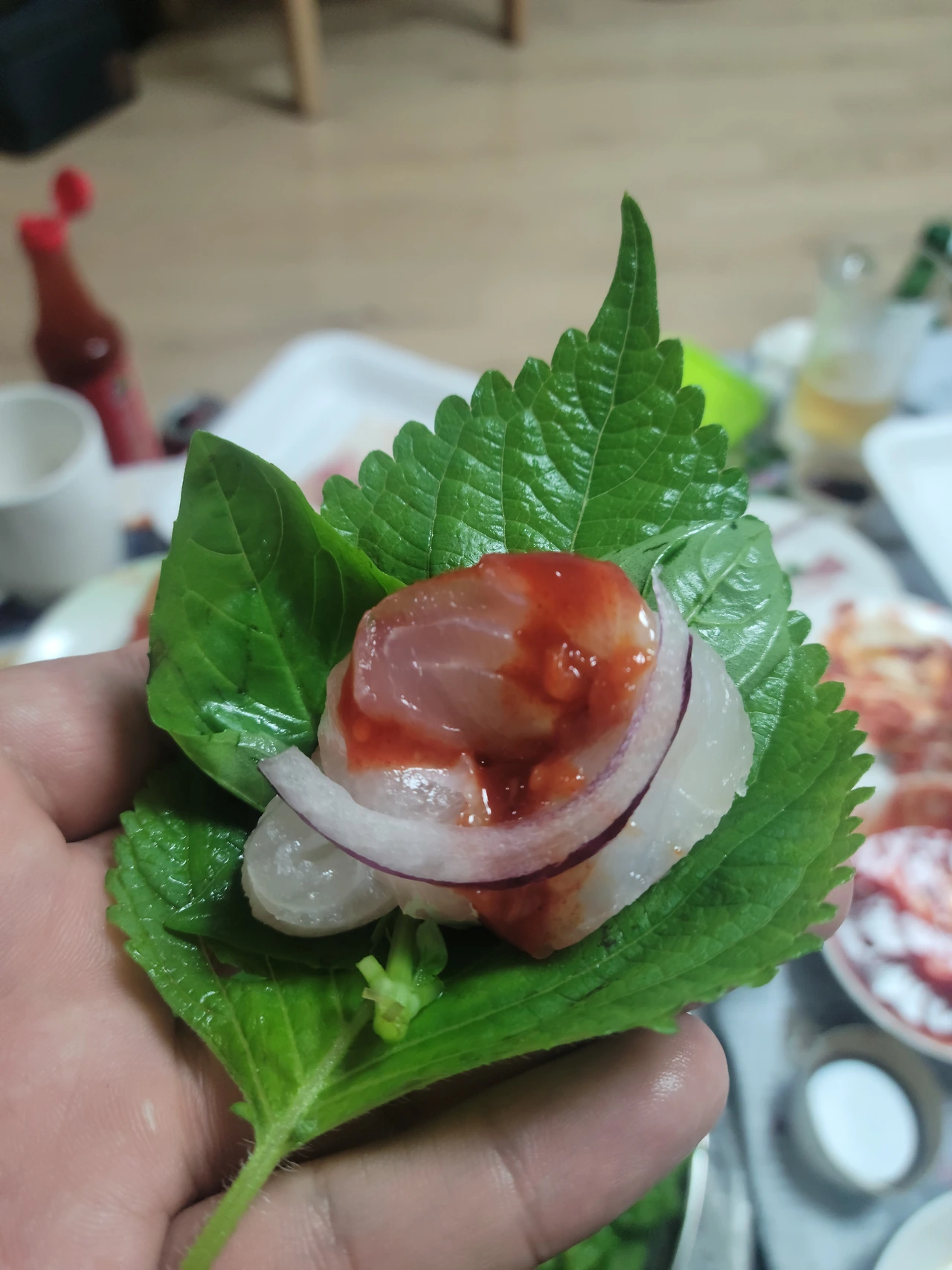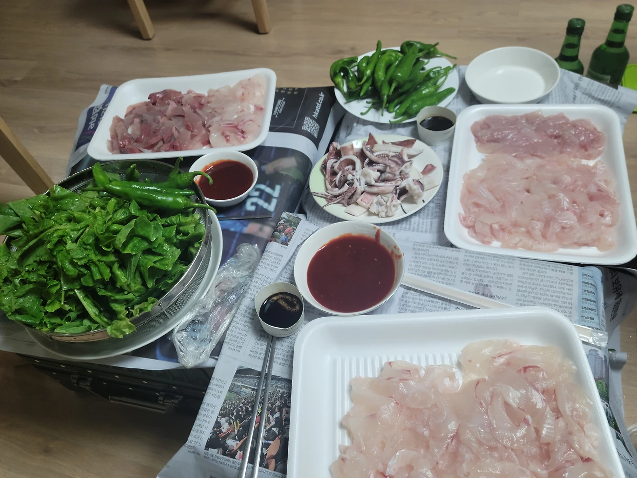 바닥에 앉아 먹을 상이 없어서 아이스박스와 캐리어 위에 신문지를 깔고 둘러앉았다. 근데 또 그게 막썬회 감성에는 더 맞는 거 같기도 하고. 부모님이 텃밭에서 기른 상추랑 깻잎, 바질(?!)도 챙겨 오셨는데, 그것에 회를 푹푹 싸 먹는 맛은 고급 횟집에서 느낄 수 없는 또 다른 감성이었다.