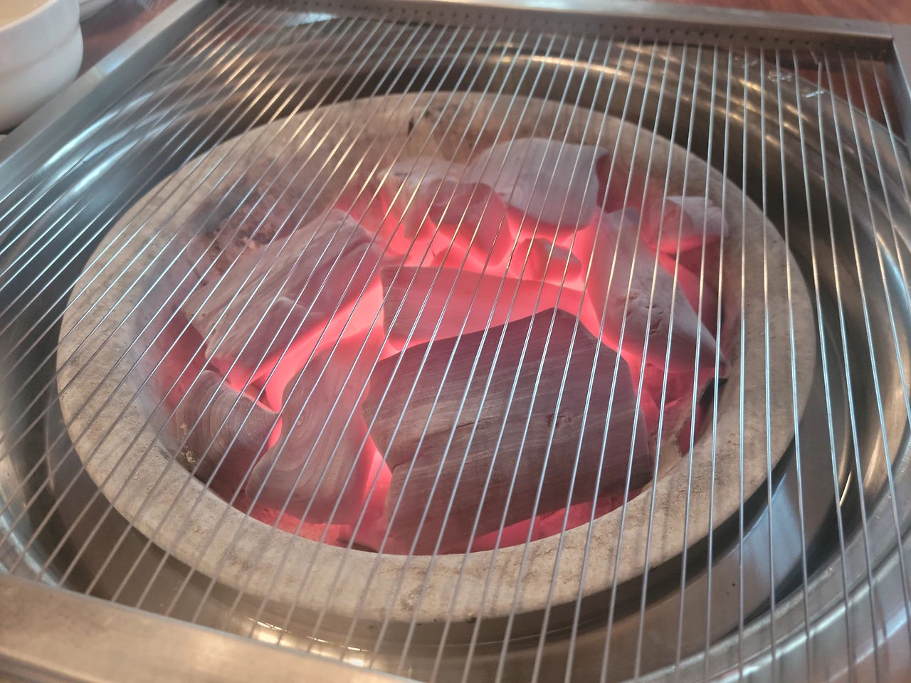 와, 다른 얘기 되게 오래 했네. 다시 평창한우마을로 돌아와서, 아버지가 결제한 고기 한 접시를 소중히 들고 2층으로 올라갔다. 친절한 직원들이 창 자리로 안내해 주었고, 이내 정말 좋아 보이는 숯이 놓였다. 고기 세 덩어리를 올리는 순서를 고민하다가, 부-채-등 순으로 굽기로 했다.