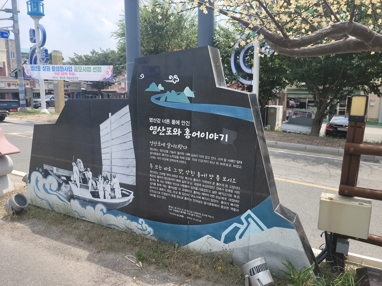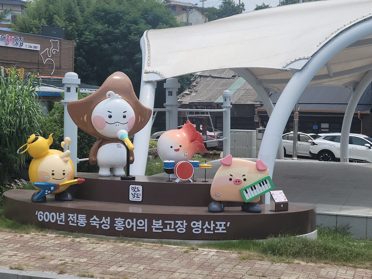 아무튼 슬슬 배도 고파 얼른 영산포 홍어거리를 찾았다. 가자마자 홍어 밴드 캐릭터 조형물이 나를 반겼다. 홍어가 보컬, 김치가 드럼을 치고 돼지가 키보드, 막걸리가 베이스를 치고 있었다. 아아, 홍어 삼합 + 막걸리, 홍탁밴드구나. 묘하게 귀엽고 열받게 생긴 녀석들을 뒤로하고 식당을 찾았다.