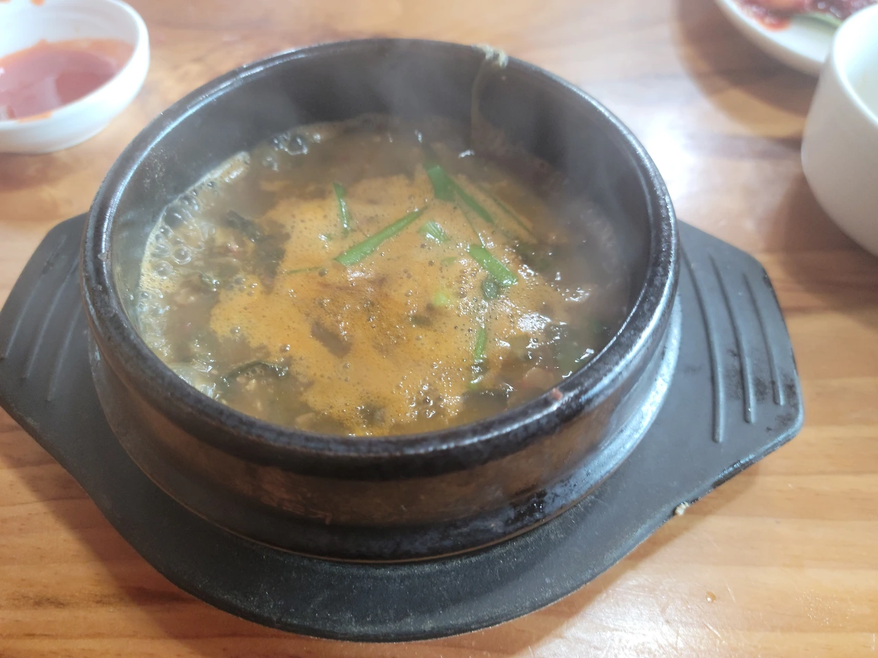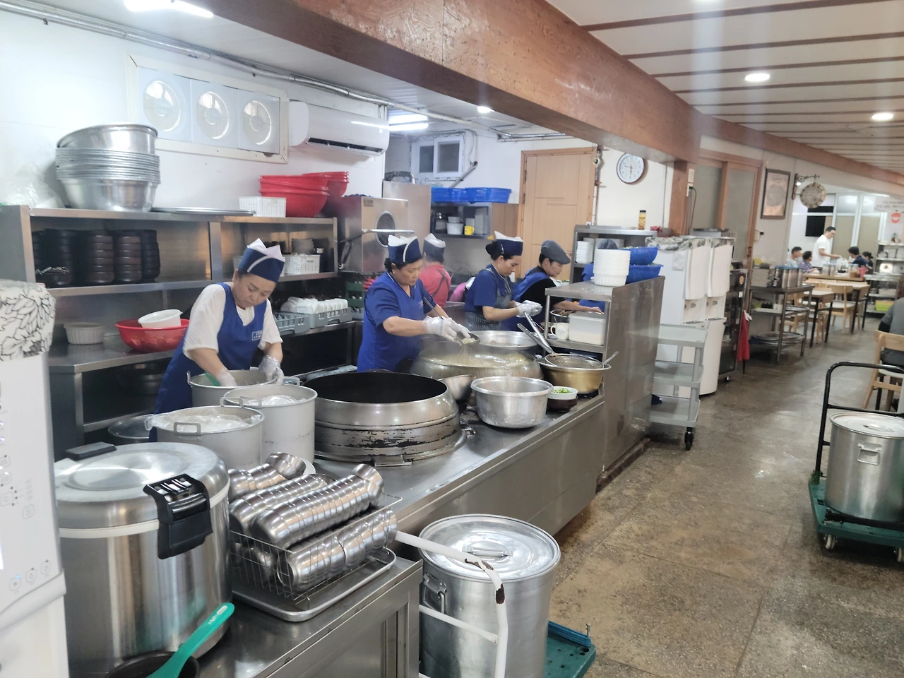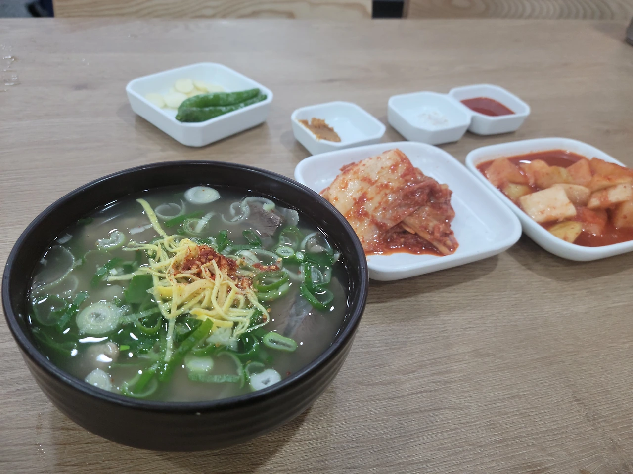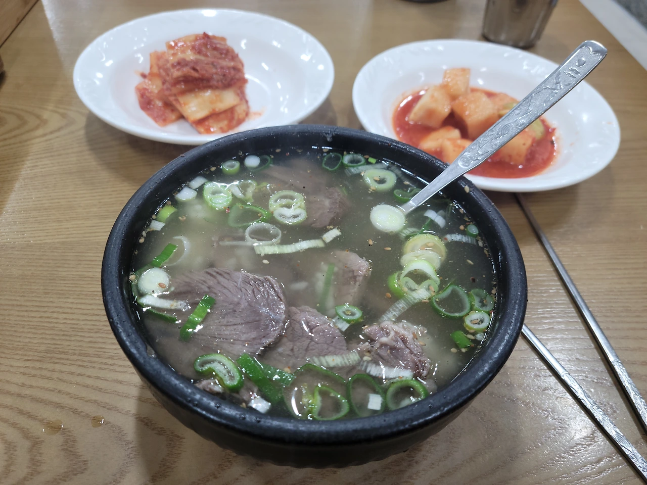 앉아서 주문을 하고 1분도 지나지 않아서 음식이 나왔다. 역시 K-패스트푸드, 국밥이다. 과연 맑은 국물 안에 고기가 넉넉히 들어있었고, 밥이 말아져 나왔다. 국밥에 밥을 따로 주는 걸 좋아하는 사람도 있지만, 나는 괘념치 않는다. 오히려 큰 솥에서 밥을 토렴하는 것을 보면 가슴이 뛴다. 밥알 하나하나가 국물 안에서 풀어지는 것은 또 내가 직접 말아먹는 거랑은 느낌이 다르니까.