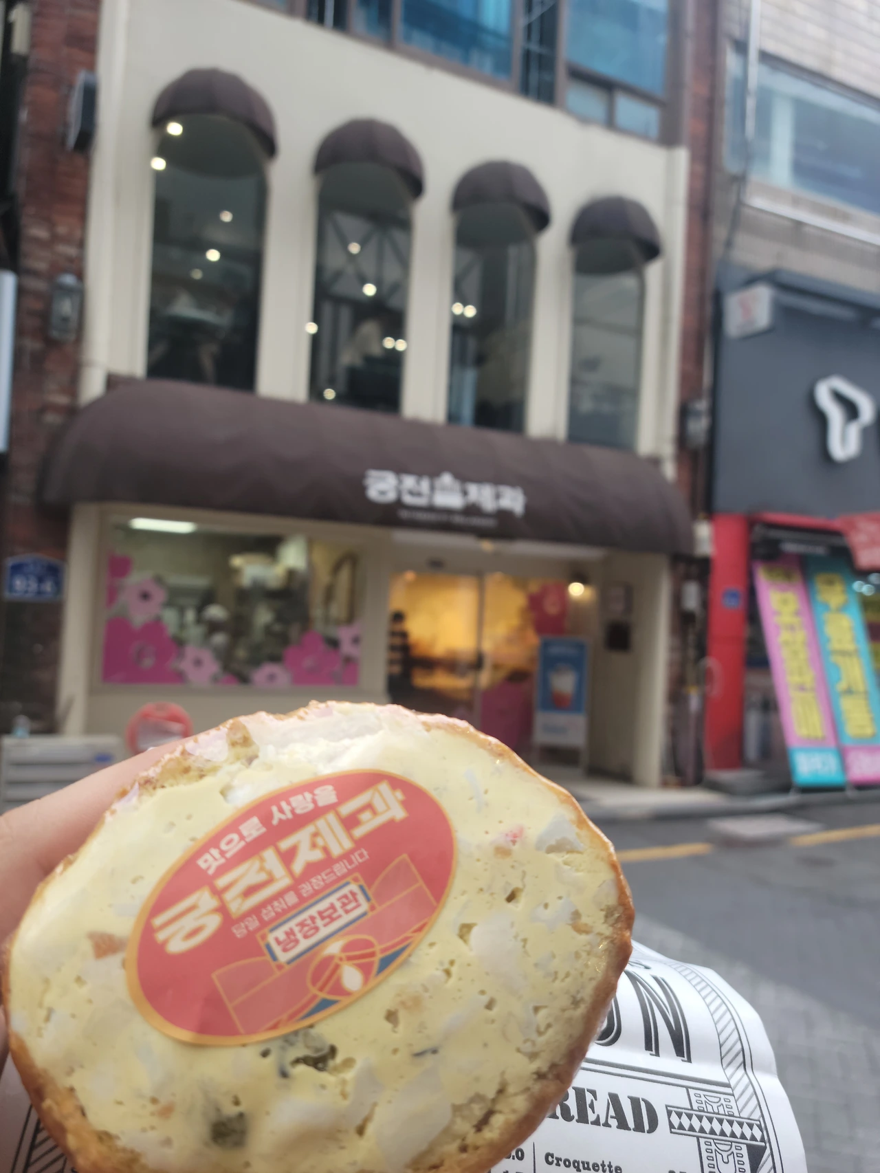 궁전제과. 공룡알빵과 나비파이가 유명하다. 공룡알빵은 바게트 끝을 파서 계란샐러드를 가득 넣은 빵인데, 이름처럼 계란 서너 알은 족히 들어간 듯한 양이었다. 나비파이는 나비 모양의 사과 파이. 패스츄리가 꽤 괜찮다. 다른 빵들도 여럿 있었지만, 나는 원래 빵을 크게 좋아하는 편은 아니라… (솔직히 내가 제일 좋아하는 빵은 ‘맥주’다.) 궁전제과의 시그니처 메뉴만 맛보기로 했다.
