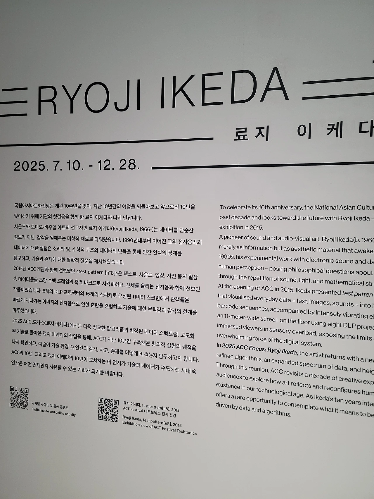 내가 본 전시는 두 개였는데, 특히 2025 ACC 포커스 <료지 이케다>가 인상 깊었다. 이 아티스트는 잘은 모르지만 100% 이공계 베이스를 가진 사람이다. “사운드 아트”라는 장르의 전시를 선보였는데, 'music'이 아닌 'sound' 아트인 것에 주목해야 한다. 멜로디도, 화성도 없는 펄스 형태의 청각 자극을 흑백의 파원으로 시각화하는데, 진짜 전자과 실험실에서나 보던 함수 발생기의 소리가 떠올랐다. 오실로스코프에 연결해 파형을 보고 싶었다. 여러 주파수를 오가는 소리랑 빠르게 전환되는 영상 때문에 넋 놓고 보고 있으면 정말로 넋이 나갈 수 있다. 공간도 크게 써서 그 시청각 자극에 압도되는 기분을 느낄 수 있었다.