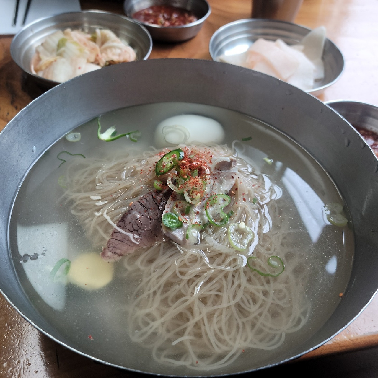 물론 중요한 것은 냉면이다. 냉면만 맛있으면 다 용서해주려고 했다. (아냐, 그래도 고기는 진짜 선 넘었다.) 냉면의 비주얼은 그냥 무난했다. 앞서 보았던 고기가 한 점씩 올라가 있었고, 계란 반 알이 들어있었다. 국물이 그냥 맹물 같으면 어쩌지 생각했는데, 걱정했던 것보다는 불투명한 느낌이었다. (고백하면 걱정보단, 기대에 가까웠다. 좀 더 기름도 안 떠있고 맑은 국물을 기대했다.) 특이하게 얇게 저민 파와 청양고추가 올라가 있었고, 고춧가루도 조금 뿌려져 있었다.