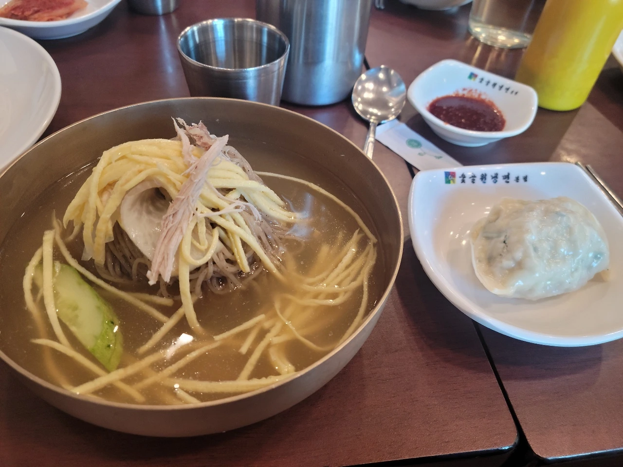 그러나 둘째는 반대로, 살짝 실망의 쓴웃음이었다. 음, 그래. 그렇다면. 개인적으로는 그냥 숯골원 냉면이 더 맛있는데? 숯골원 냉면의 넉넉하게 올라간 계란 지단이 완숙 반 알보다는 더 성의 있어 보였다. 평양냉면을 원래 꿩고기로 만드는지 돼지나 소고기로 만드는지는 내가 잘 모른다만, 숯골원 냉면이 이곳의 냉면보다 육향도 조금 더 직관적으로 더 많이 나면서도 특이해서 상대적으로 더 '별미'처럼 느껴졌다. 좀 다른 이슈긴 한데, 식기 때문일까 스뎅 냄새라고 해야 하나? 음식점 컵에서 가끔 나는 안 좋은 쇠비린내도 어렴풋이 느껴져서 좀 아쉬웠다. 또 간간히 씹히는 청양고추가 육수에 대한 몰입을 방해했다. 다음에 오면 빼달라고 해야지. 다음이 있다면.