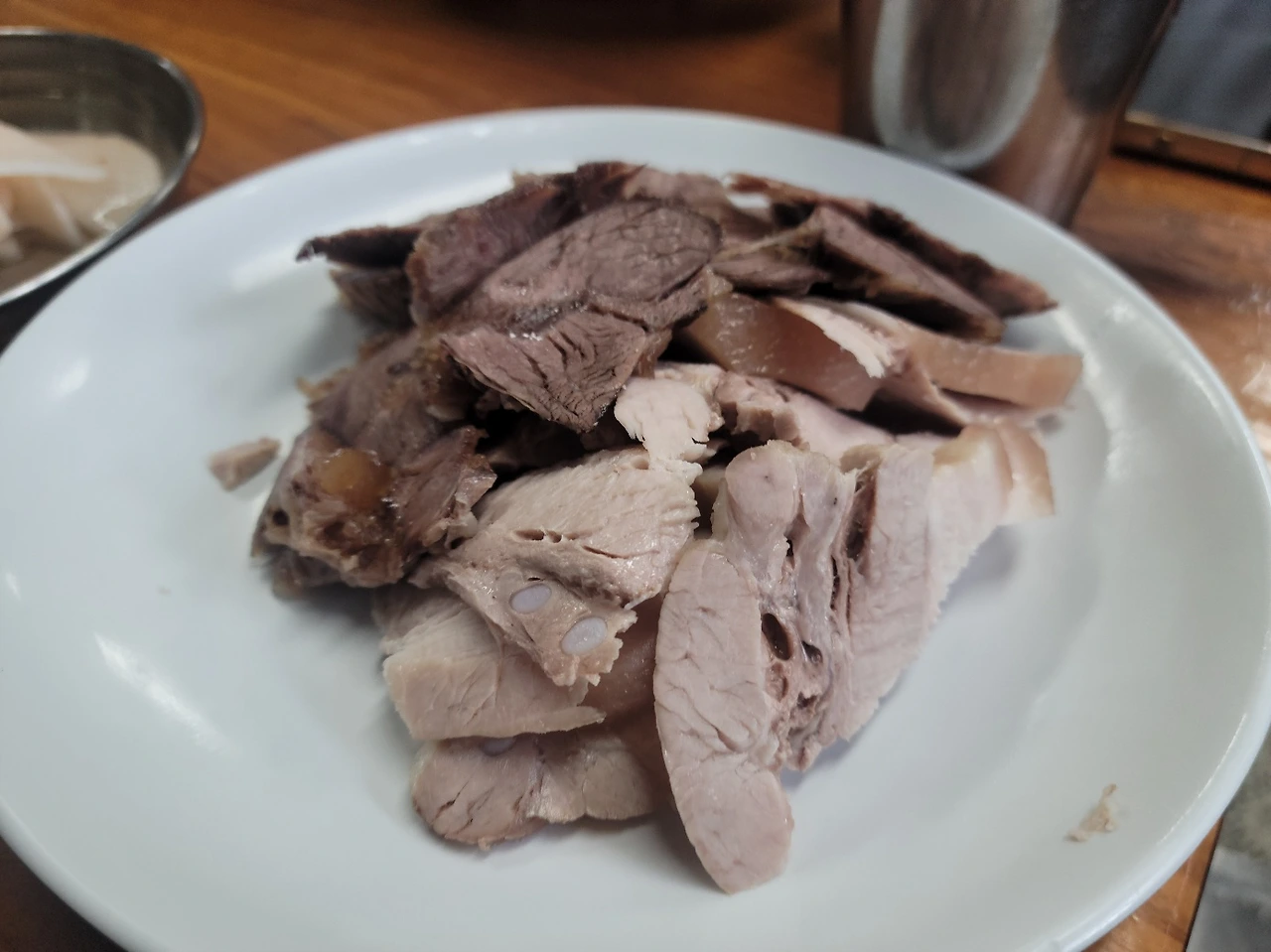 그리고 음식이 나왔다. 일단 만두는 15000원에 여섯 알, 솔직히 9000원 정도 받으면 딱 적당할 거 같지만 뭐 인정이다. 여럿이서 하나씩 맛보기로 먹기는 충분히 괜찮은 경험이었다. 근데 이제 3만 원이 넘었던, 제육/수육 고기가 진짜 너무 섭섭했다. 냉면 위에 올라가는 고명을 조금 더 썰어준 느낌이었는데, 진짜 내 손바닥 위에 다 올려놓을 수 있을 정도의 양이었다. 심지어 그 맛도 그냥, 삐쩍 마른 양지고기 느낌이었다. 부드럽고 촉촉한 고기를 기대한 건 아니었다. 냉면 고명에 올라가는 얇은 고기 대충 어떤 느낌인지 안다. 그러나 이건 육즙을 모두 냉면 육수에게 희생한, 말하자면 고기였던 것- 미라를 먹는 느낌이었다.