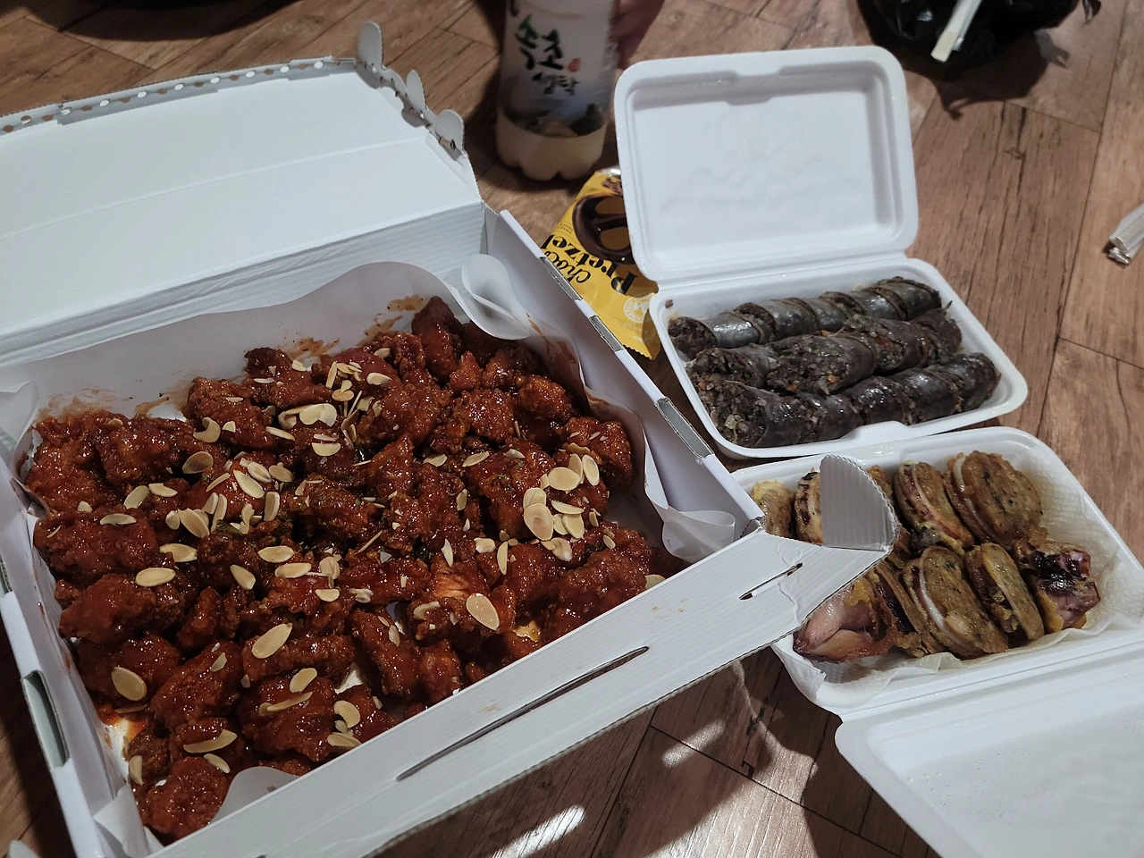 이불을 대충 가장자리로 치워두고, 가운데 음식을 깔아놓고 둘러앉아서 맛있게 또 음식을 먹었다. 술을 더 먹었다기보다는 그냥 안주를 맛있게 먹은 것 같다. 회가 담백하긴 한데, 또 이럴 때는 기름진 게 땡기지 응응. 닭강정은 사실 내가 평소 많이 먹는 음식은 아니어서 엄청 특별한지는 모르겠는데, 그냥 우리가 딱 상상하고 기대하는 '닭강정' 맛이었다. (근데 그걸 못하는 집이 많기도 해.) 사실 닭강정은 식은 뒤 먹는게 더 맛있다던데, 잘 모르겠음. 튀김은 따뜻할 때가 제맛 아닌가. 그래도 식어야 '강정'의 정체성은 잘 살아나는 게 맞는 거 같고, 따뜻한 닭강정보다는 그냥 치킨이나 가라아게가 낫다. 아 생각하니 닭강정만의 매력이 있긴 하네요. 그래도 식혀서 먹으라는 게 '실온' 닭강정을 먹으라는 거지 냉장보관 해서 먹는 게 더 맛있는 건 아닌 듯하다. 다음날 먹는데 뱉고 싶었다.