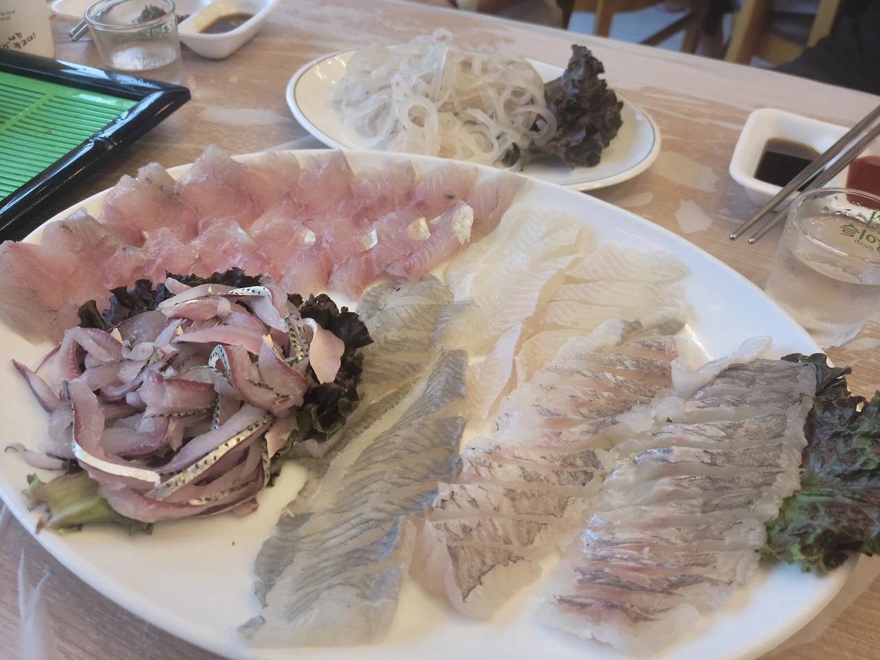 이번에도 상차림비를 포함해서 8만 원 대에 다양한 생선들을 먹게 해 준다길래 그 집에서 그냥 먹었다. 생선이 크진 않았는데 뭐, 전어도 있고 오징어도 있고. 그래도 인당 3만 원 정도는 생각했는데 이 정도면 거저지,라고 생각했다. 어차피 술 먹는 사람 입장에선 결국 '매운탕'을 먹기 위한 과정에 불과하다. 밑반찬이 잘 나오진 않았는데, 별로 기대는 안 했다. 그래도 나온 회의 양이 꽤 됐고, 나갈 즈음에는 우리가 먹었던 집이 그래도 테이블도 다 차길래 적당히 잘 왔나 싶었다.