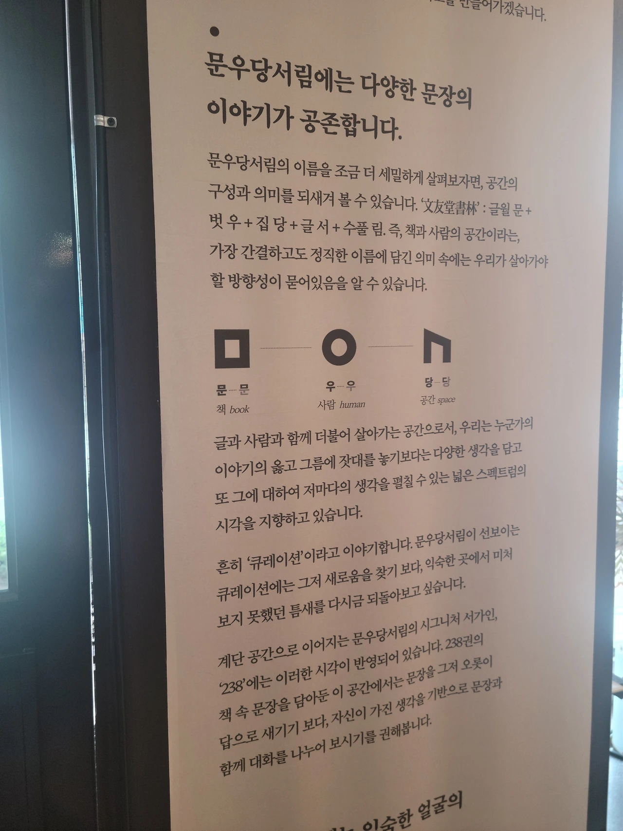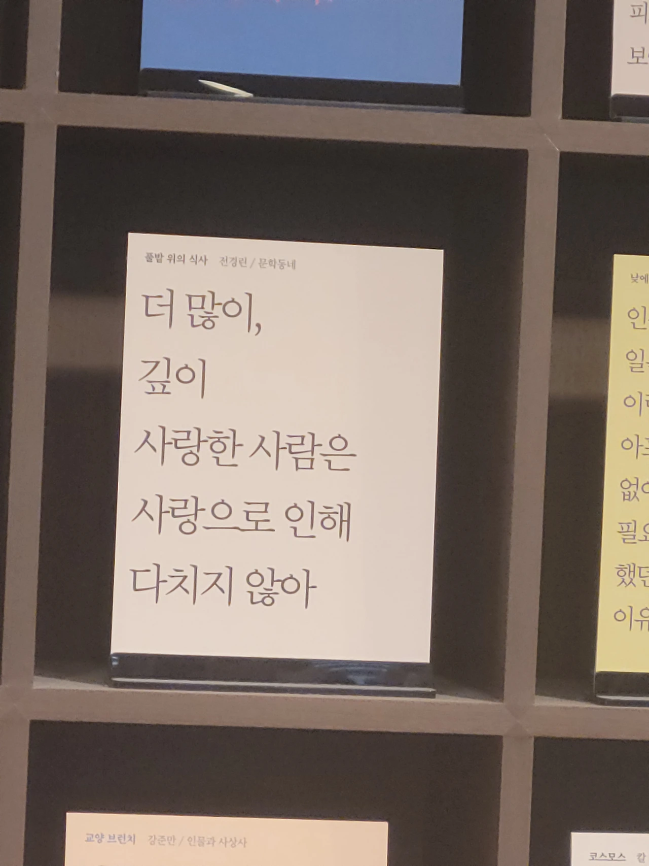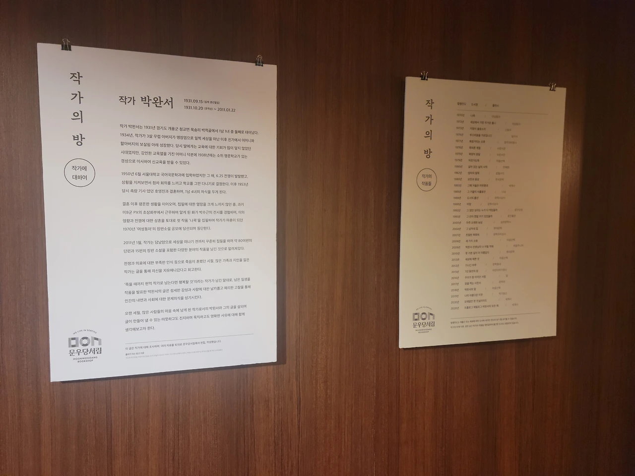 한참 경관(?)을 즐기며 속초를 뚜벅뚜벅 걸어 도착한 곳은 "문우당 서림"이라는 책방이었다. 전주에서 방문했던 양귀자 작가의 "홍지서림"은 사실 굉장히 무난한 동네 서점 느낌이었는데, 우연히 알게된 이곳은 굉장히 책을 사랑하는 사람들이 꾸며놓은 공간이라는 느낌이 들었다. 서가의 구성부터 '한국문학', '사회정치' 이런 분류가 아니라, 책장마다 책의 구성과 전시하는 방식에 고심한 흔적이 엿보였다. 이른바 책 큐레이팅을 시도한 것이 좋았다. 또, 쉽게 접할 수 없는 로컬 작가들의 작품이라던가 독립출판물도 다양하게 만날 수 있어서 주인장이 굉장히 MZ하고 요즘 유행한다는 '텍스트 힙'도 이해하시는 분이구나 싶었다. 특히 인상깊었던 것은 "작가의 방"이라고, 하나의 작가에 대해 작품들과 좋은 글귀들을 모아놓은 작은 공간이 있었는데. 내가 방문했을 때는 박완서 작가를 테마로 있었다. 이게 분기마다 혹시 작가가 바뀌려나? 궁금했다. 모쪼록 백문이 불여일견, 속초를 갈 일이 있다면 꼭 한 번 방문하는 것을 권한다. 책을 좋아하는 분들이라면 분명 좋아할만한 곳.